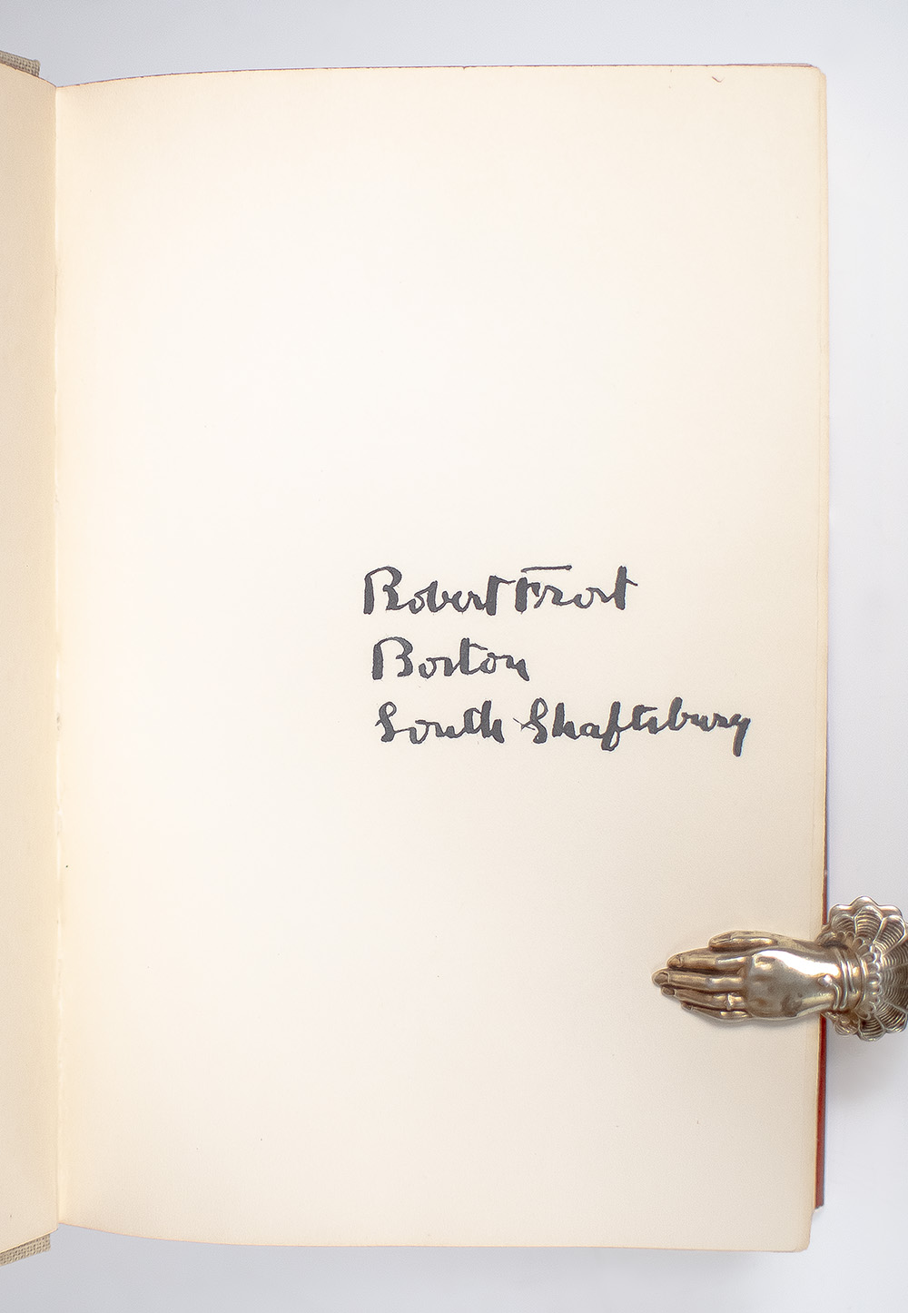 First edition of this collected poems of Frost. Octavo, original cloth, top stained red, frontispiece photograph of Robert Frost taken by Doris Ulmann. Boldly signed by the author on the second free endpaper, "Robert Frost Boston South Shaftsbury."  Near fine in a very good dust jacket, bookplate.