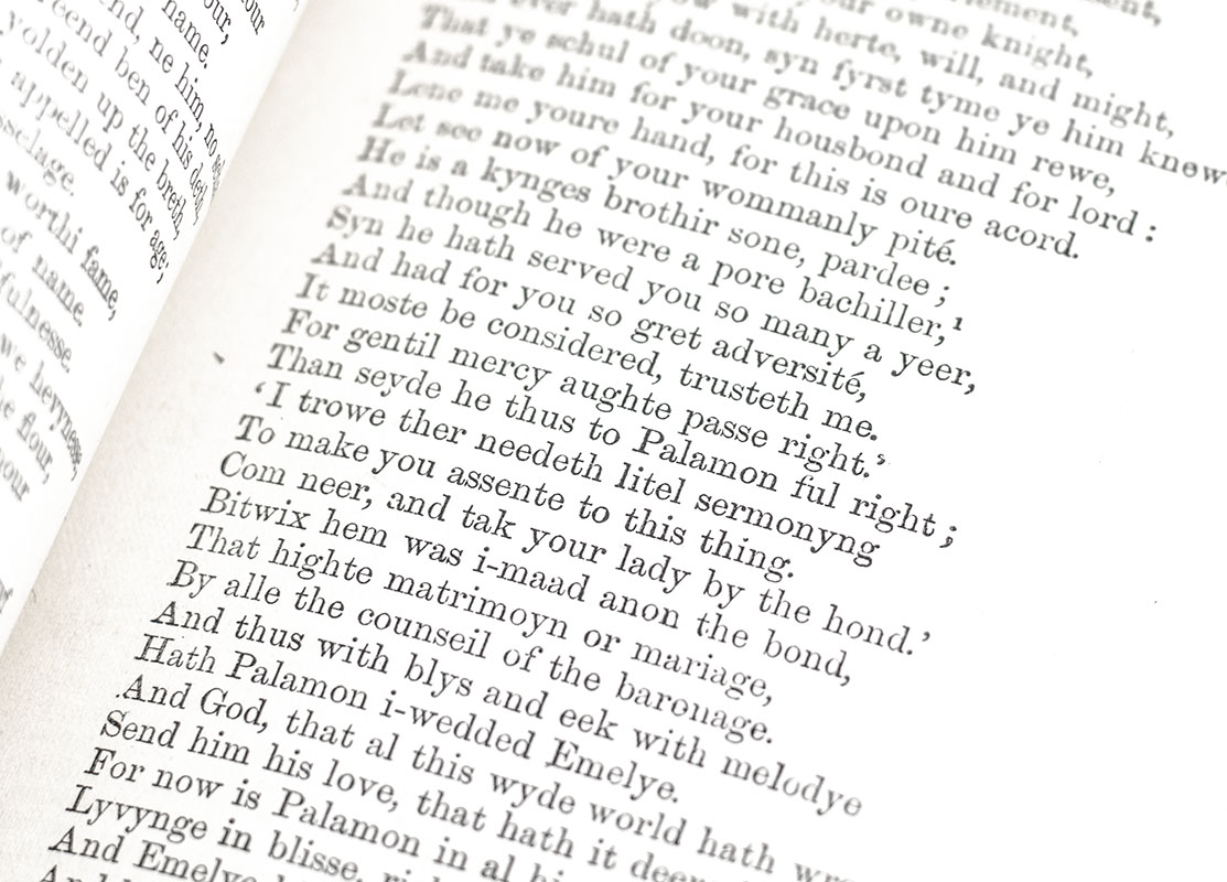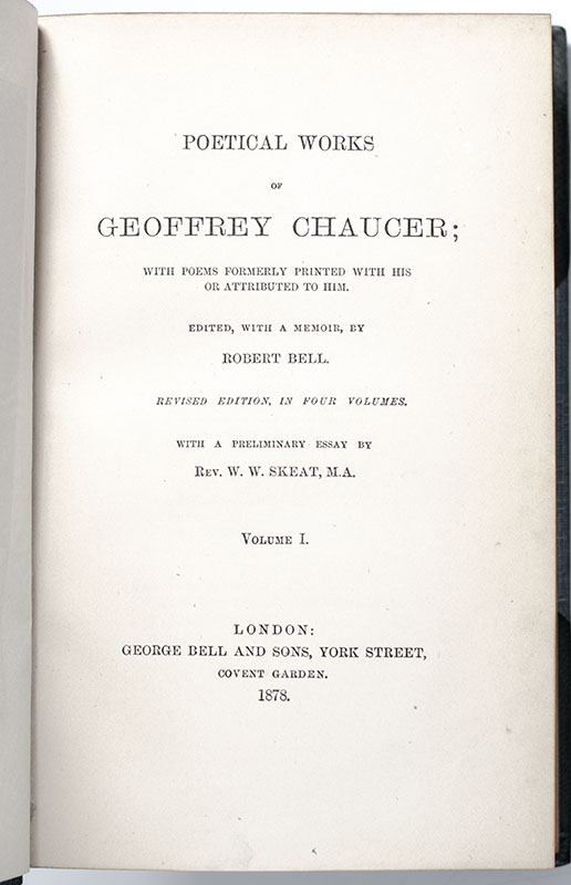 Finely bound set of Chaucer's poetical works. Small octavos, four volumes bound in three quarters morocco by Bayntun Bindery with gilt tooling to the spine and red morocco spine labels lettered in gilt in six compartments within raised bands, top edge gilt, marbled endpapers, tissue guarded frontispiece portrait of Chaucer to volume one. In near fine condition.