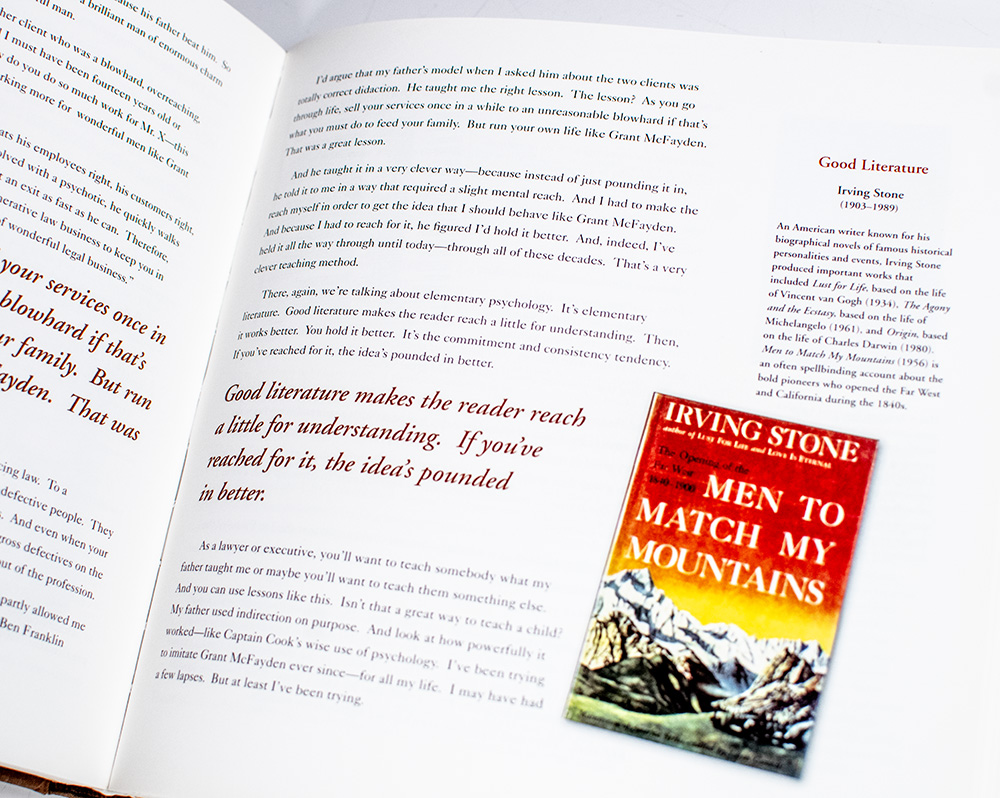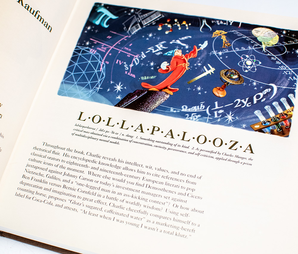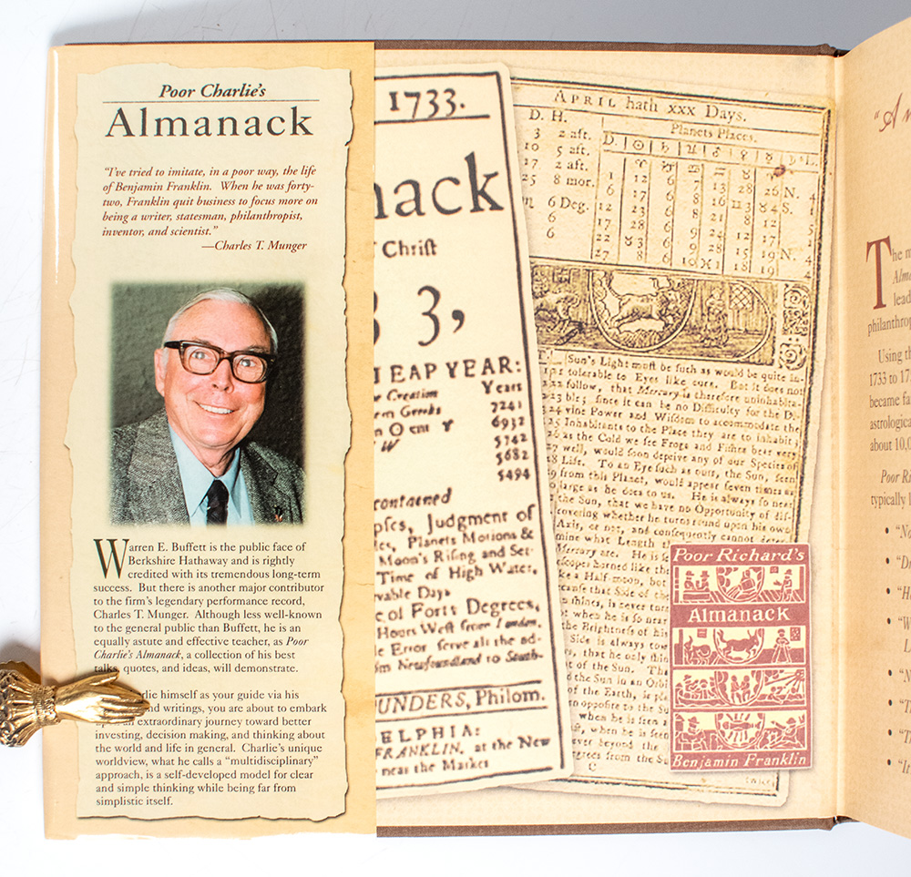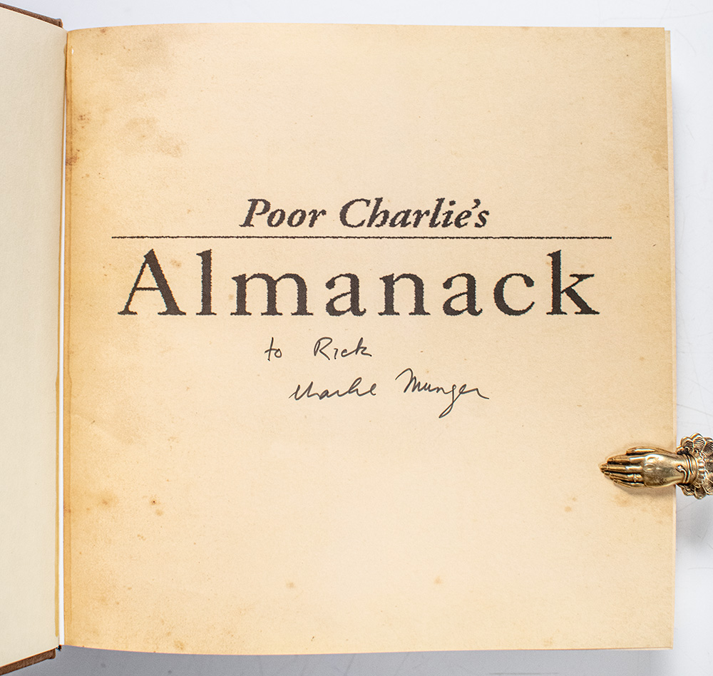 First edition of this classic work. Oblong quarto, original cloth, illustrated. Presentation copy, inscribed by Charlie Munger on the half-title page, "to Rick Charlie Munger." Fine in a fine dust jacket. Foreword by Warren E. Buffett. Edited by Peter D. Kaufman. Accompanied by a letter of provenance from Rick Levey about acquiring the book laid in. Rare and desirable signed.