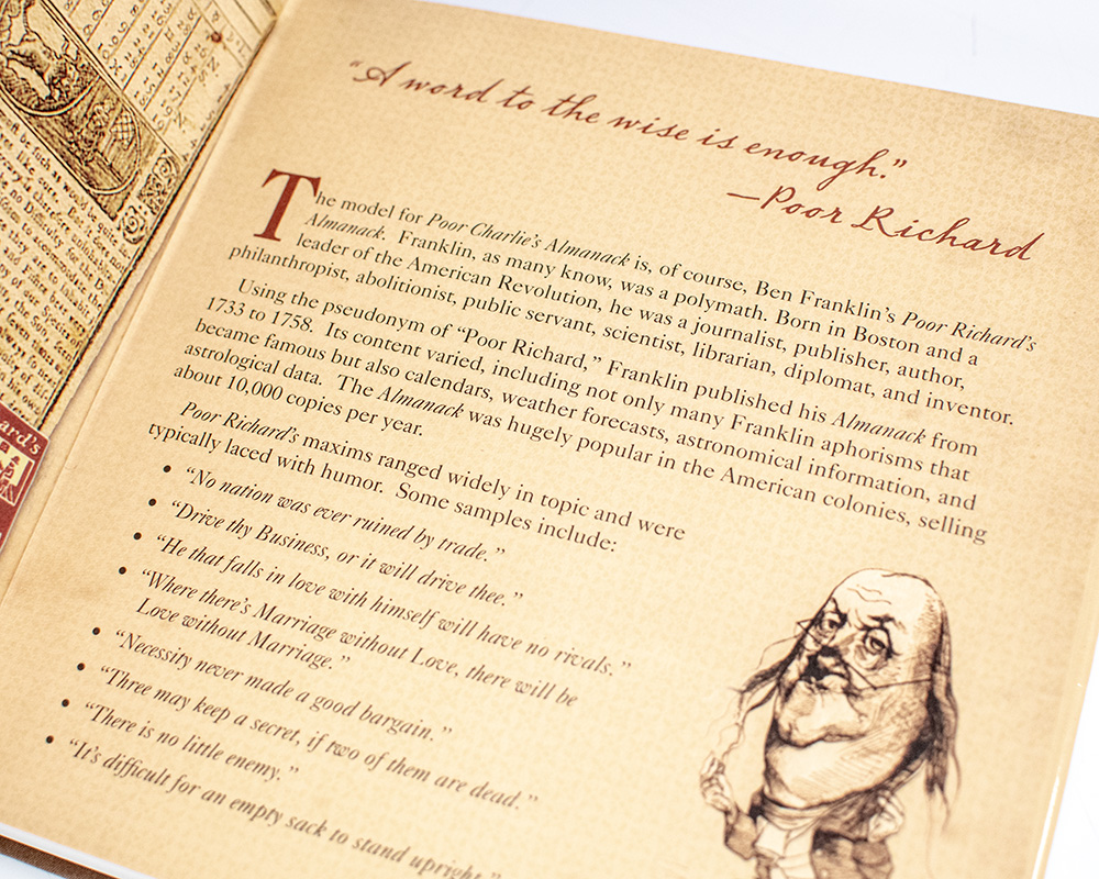 Charlie Munger is the long-serving vice-chairman of Berkshire Hathaway. This book brings together his investing thoughts beyond his famous statement "I have nothing to add." Munger is an admirer of Benjamin Franklin, and the book's title is a tribute to Franklin's Poor Richard's Almanack.