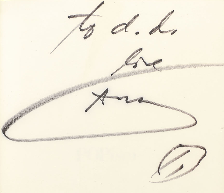 First edition of Warhol's sensational 1980 memoir. Octavo, original boards, illustrated with photographs. Association copy, inscribed by Warhol on the front free endpaper, "to D.D. love Andy." Warhol has also added a small drawing beneath the inscription. The recipient, New York fashionista D.D. Ryan was an editor at Harper’s Bazaar and widely credited for encouraging the "birth" of Kay Thompson's beloved children's character Eloise, who lived at the Plaza Hotel. Thompson first conceived of Eloise as a cabaret act and it was Ryan that encouraged her to write a book about the amusing character, resulting in Thompson's 1955 "Eloise" illustrated by Hilary Knight. Ryan began her career as an assistant to photographer Richard Avedon and later worked as photo editor at Harper's Bazaar under Diana Vreeland. Fine in a near fine dust jacket. Additionally signed by Warhol on the front panel of the dust jacket. Housed in a custom chemise slipcase.