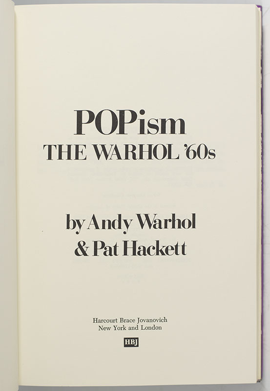 First Edition of POPism: The Warhol '60s; singed and inscribed by Andy Warhol to New York fashionista and Harper's Bazaar editor D.D. Ryan