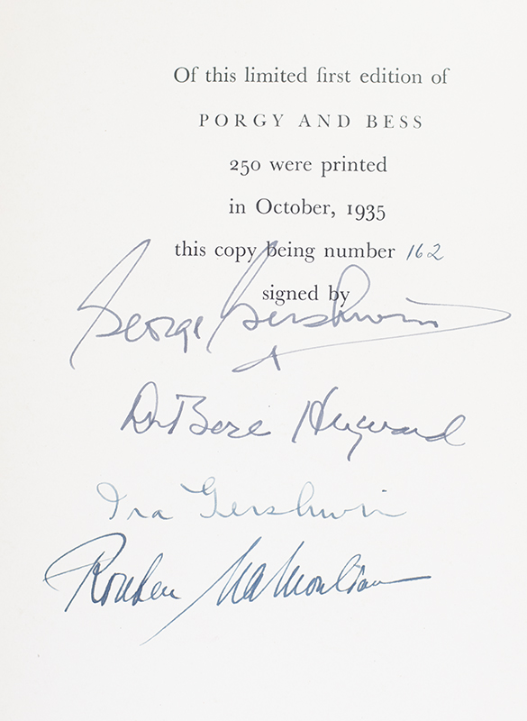 SIGNED LIMITED FIRST EDITION OF PORGY AND BESS; SIGNED BY GEORGE AND IRA GERSHWIN, DUBOSE HEYWARD, AND ROUBEN MAMOULIAN