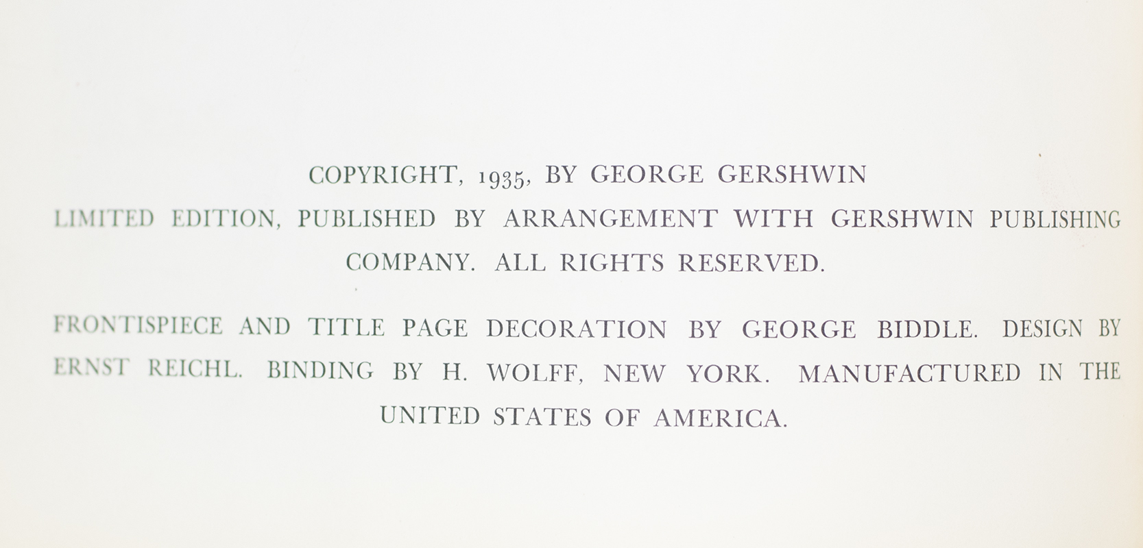 Gershwin read Porgy in 1926 and proposed that he should collaborate with Heyward on Porgy and Bess. In 1934, Gershwin and Heyward began work on the project by visiting the author's native Charleston. Gershwin explained why he called Porgy and Bess a folk opera in a 1935 New York Times article: "Porgy and Bess is a folk tale. Its people naturally would sing folk music. When I first began work in the music I decided against the use of original folk material because I wanted the music to be all of one piece. Therefore I wrote my own spirituals and folksongs. But they are still folk music – and therefore, being in operatic form, Porgy and Bess becomes a folk opera." Today, Porgy and Bess is widely considered to be Gershwin’s masterpiece. This deluxe edition of the piano-vocal score (according to Fuld, no orchestral score has ever been published) was published in 1935, the year of Porgy and Bess premiere, almost simultaneously with the first edition, and is boldly signed on the limitation page (at the rear) by George and Ira Gershwin and the other principal creators of Porgy and Bess: librettist DuBose Heyward and director Rouben Mamoulian (Fuld, 539).