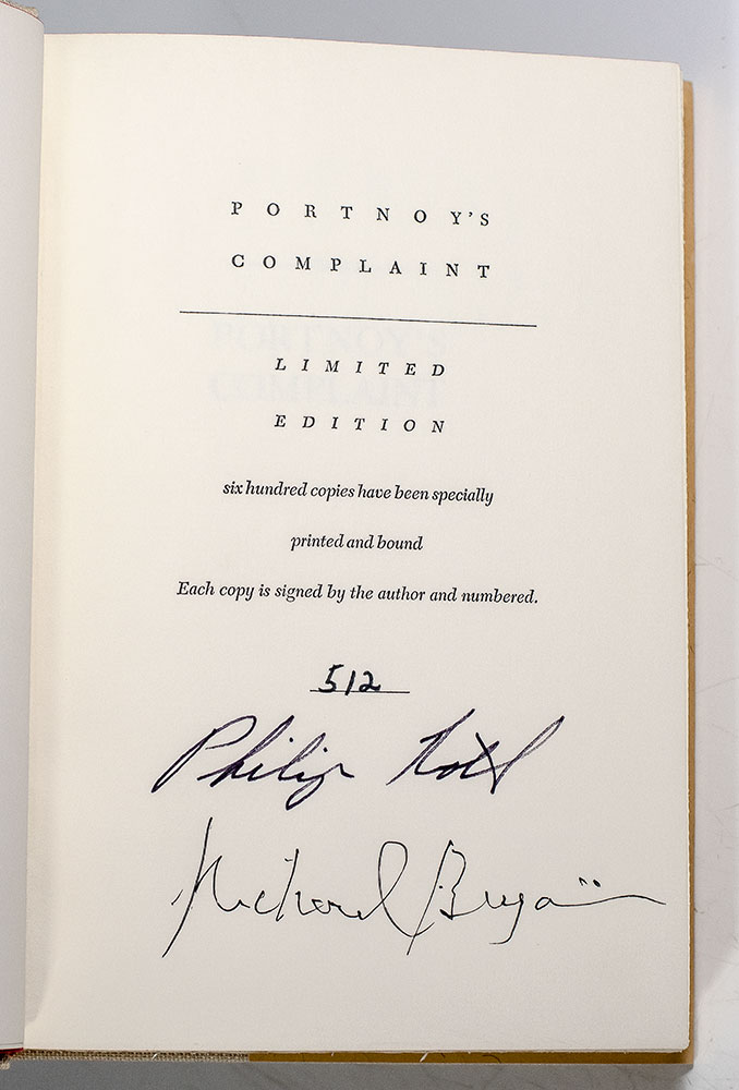 Signed limited first edition of Roth's breakthrough novel. Octavo, original cloth, slipcase. One of 600 numbered examples signed by Philip Roth and additionally by actor Richard Benjamin, who starred in the 1972 adaptation. Fine in a near fine dust jacket. The slipcase is in near fine condition. Housed in a custom half morocco slipcase. An exceptional example.