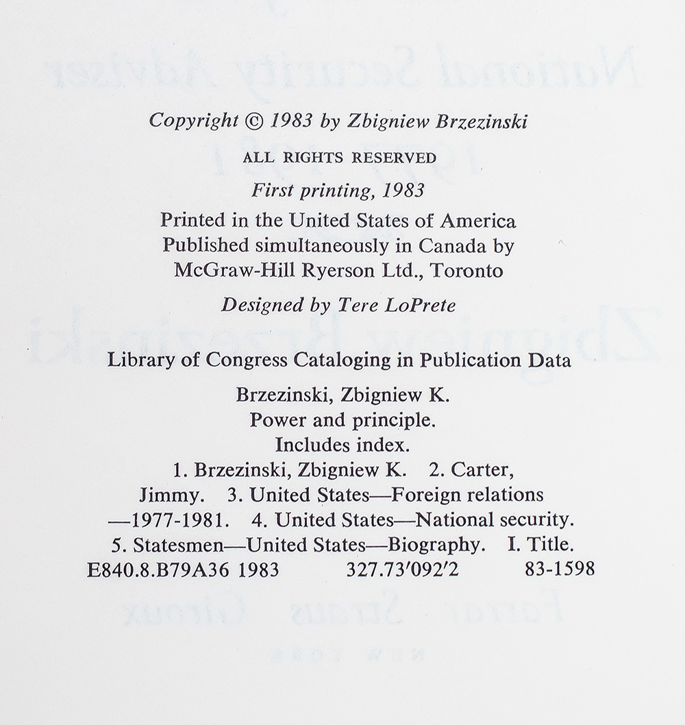 First Edition of Power and Principle: Memoirs of the National Security Adviser; Inscribed by Zbigniew Brzezinski