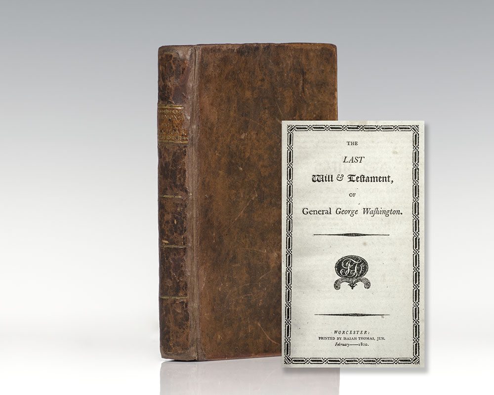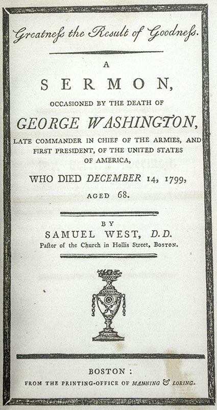 Sammelband collection of thirteen sermons, orations and memorials addressed by some of the leading historical and clerical figures in mid-eighteenth century Boston, with particular focus on sermons preached on the occasion of the death of the first president of the United States, George Washington with his Last Testament and Will included. Contents include both printed text and hand-written script, including: The Last Will & Testament of General George Washington(1800), Extract of a Sermon Preach'd at the South Church in Boston by the Reverend Mr. Thomas Prince(1746), A Sermon Occasioned by the Death of George Washington by Samuel West, Pastor of the Church of in Hollis Street, Boston(1796), A Defence of the Legislature of Massachusetts or the Rights of New England Vindicated(1804), and An Oration of the Sublime Virtues of General George Washington(1800). Octavo, bound in full period calf, gilt titles to the spine, morocco spine label. Period bookplate from the library of William Peters Reeves, Westboro, Mass., Sept. 1908. In very good condition. An exceptional collection.
