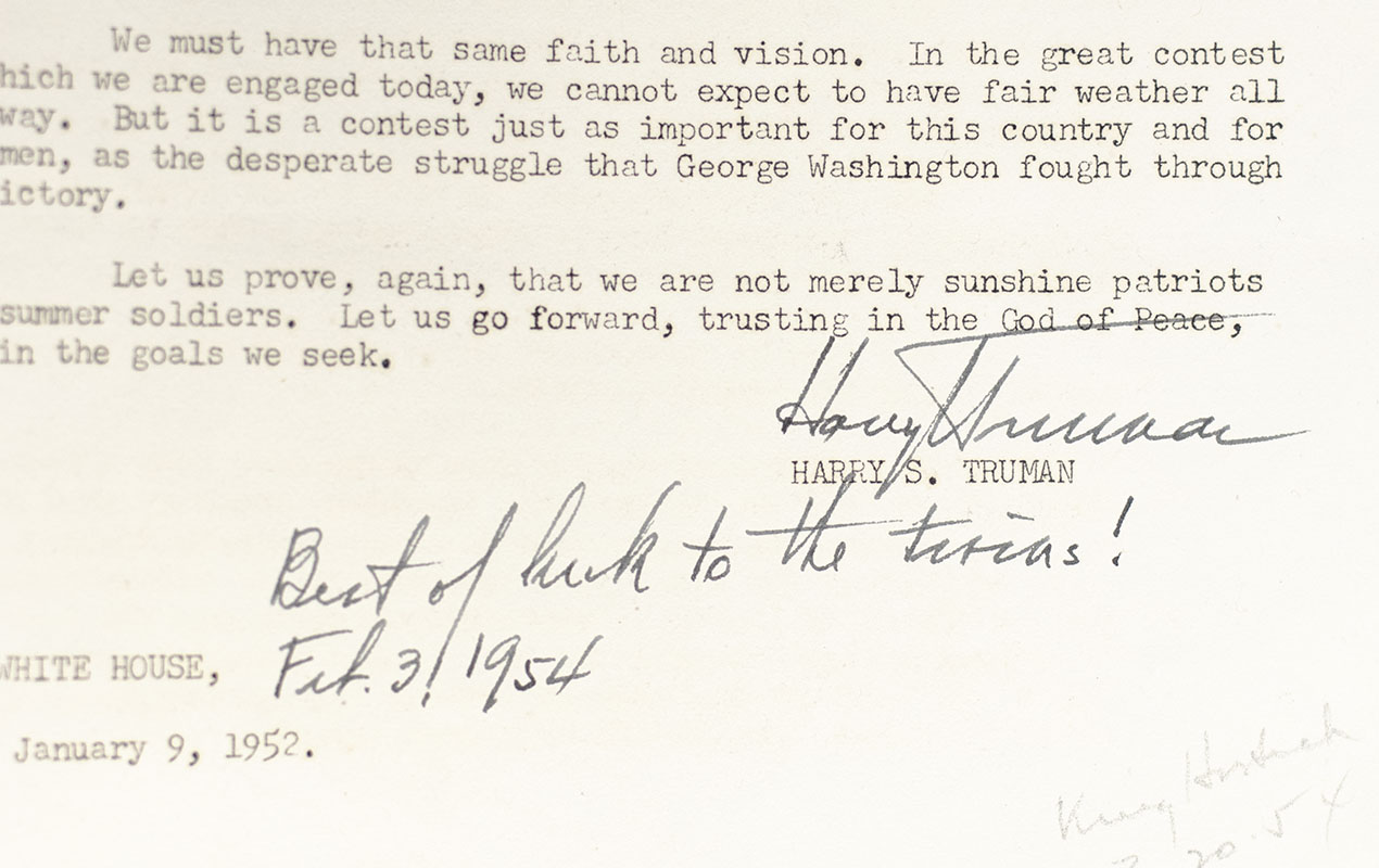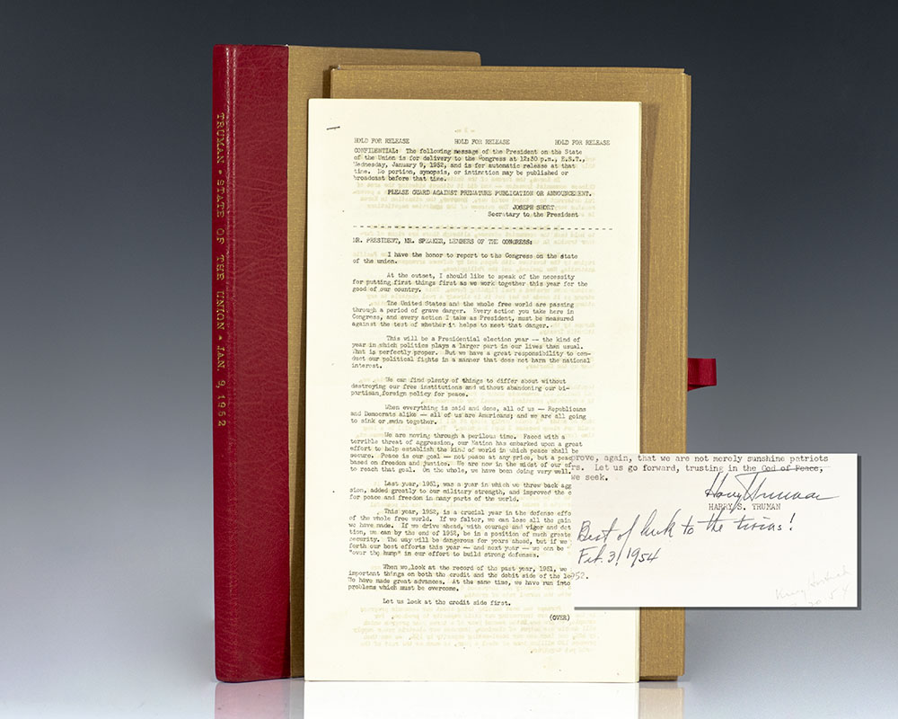 Rare advance press transcript of Truman's penultimate State of the Union Address, delivered at the height of the Korean War and discussing steps that the free world was taking to halt Soviet and Chinese Communist aggression. Folio, five pages, typescript. Presentation copy, inscribed by Truman at the conclusion of the speech, "Harry Truman Best of luck to the twins! Feb 3. 1954." The hot war in Korea and cold war in Europe came to dominate the end of Truman's second term, and also dominate this speech. Doubts about his ability to handle these crises were lowering the President's popularity daily, and several months after delivering it he announced he would not run in 1952. In fine condition. Housed in a custom cloth chemise and half morocco slipcase. Rare, as this confidential distribution would have been produced in a very small number, most being discarded after use.