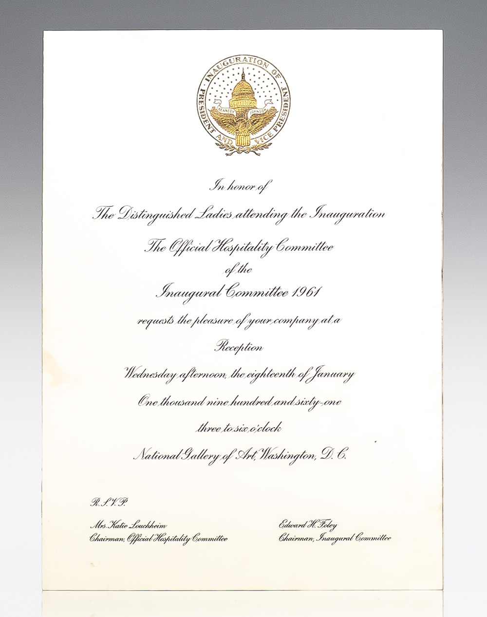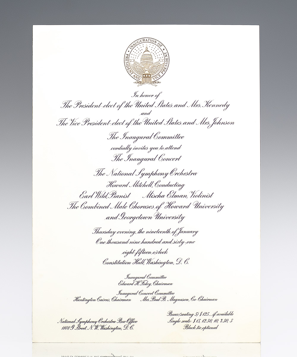Group of rare invitations to events surrounding the Kennedy inauguration; from the collection of Helen Keyes, longtime personal assistant for the Kennedy family. The collection includes: An invitation to attend "The Official Distinguished Ladies" reception hosted at the National Gallery by the "Official Hospitality Committee of the Inaugural Committee 1961" on January 18th, 1961; an invitation addressed directly to Helen Keyes requesting her attendance at a reception and buffet hosted by the National Symphony Orchestra "in honor of Mrs. Franklin D. Roosevelt" on January 19th, 1961 at Constitution Hall, accompanied by the original mailing envelope with stamp and address; and an invitation to attend "The Inaugural Concert" hosted by the National Symphony Orchestra on January 19th, 1961 at Constitution Hall. The recipient, Helen Mary Keyes, had ties to the Kennedy family long before her working association. Her father was the dentist to Joe and Rose Kennedy's children and the families' children became friends. Helen played a major role in JFK's 1952 Senate campaign, hosting famous 'Ladies Teas' for the rising star of the Democratic Party. Her involvement continued throughout the Kennedy administration and during both the 1960 and 1964 Presidential campaigns. Each piece measures 7 inches by 9.75 inches with the exception of the letter addressed directly to Mrs. Keyes, which measures 6.5 inches by 8.5 inches. All are in fine condition with light toning.
