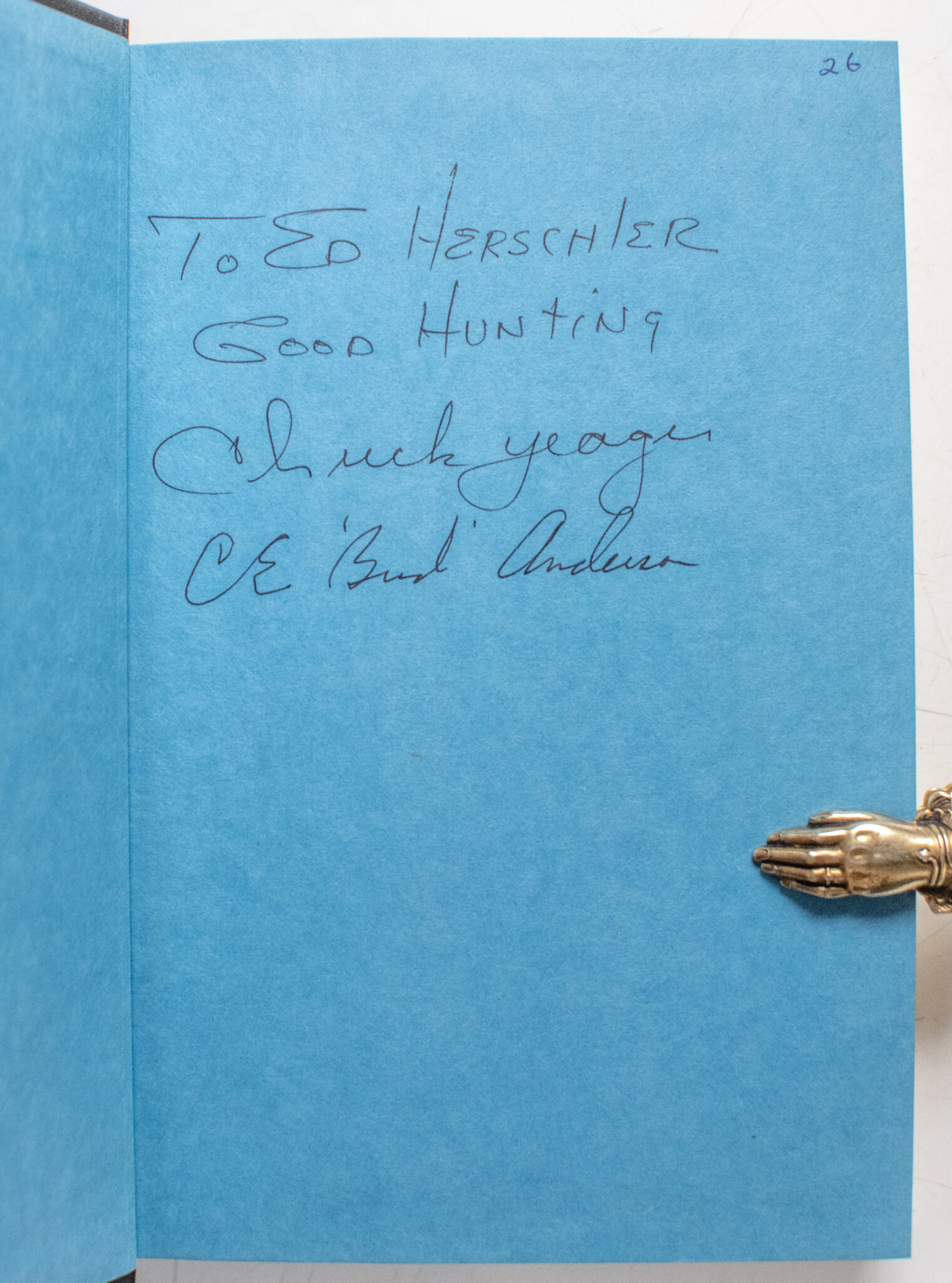 First edition of Yeager's second autobiography. Octavo, original publisher's half cloth, illustrated with black and white photographs. Presentation copy, inscribed by the author on the front free endpaper "To Ed Hershler Good Hunting Chuck Yeager and additionally signed by legendary pilot Bud Anderson. The recipient Ed Hershler was Governor of Wyoming. Near fine in a near fine dust jacket. Jacket photo by Mark Homan.