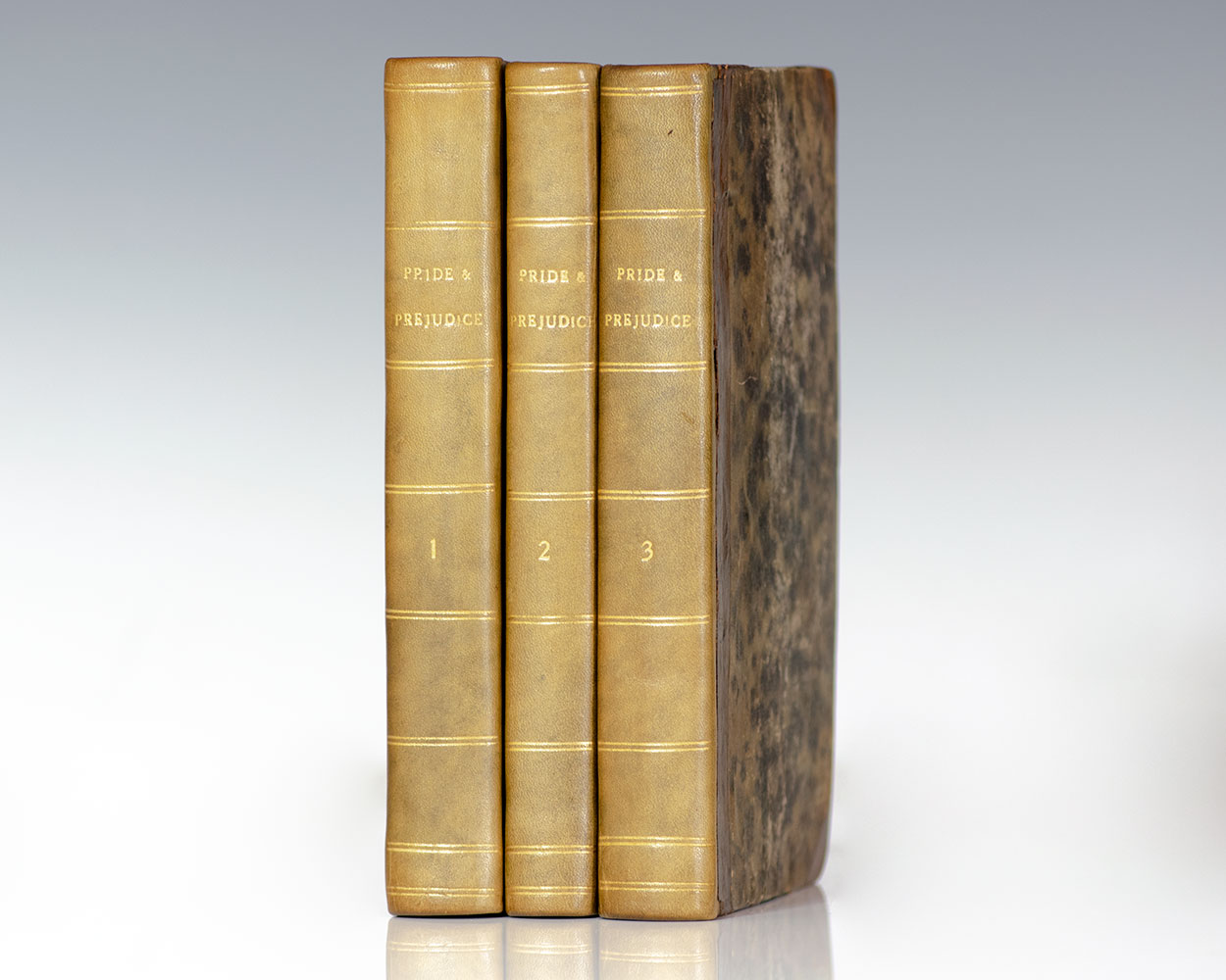 First editions of all three volumes of Jane Austen's second novel and most popular. Octavo, three volumes, bound in contemporary three quarter calf over marbled boards with gilt titles to the spine. In very good condition. Armorial bookplates to each pastedown. Period gift inscription from the year of publication to the title page of Vol. I.: "Mary Anne King given her by her mother April 1813." An exceptional example of this landmark work in English literature, rare and desirable bound in contemporary calf.