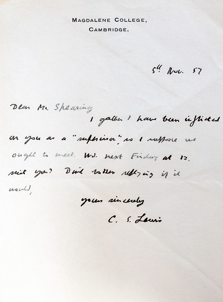 First edition of the second book in Lewis' beloved Narnia series. Octavo, original cloth, cartographic endpapers, illustrated by Pauline Baynes. With an autograph note signed by C.S. Lewis to his PhD student at Cambridge, Anthony Spearing. On Lewis' Magdalene College, Cambridge letterhead, the note reads in full, "5th Nov. 57 Dear Mr. Spearing, I gather I have been inflicted as you as a "superior" so I suppose we out to meet. Wd. next Friday at 12 suit you? Don't bother replying if it would. Yours sincerely C. S. Lewis." The recipient of the letter, Anthony Spearing was assigned to report to Lewis as his PhD supervisor when he arrived as a student at Cambridge the same year Lewis arrived from Oxford as the first occupant of the new chair of Medieval and Renaissance English. He noted that "Lewis was extremely conscientious in commenting in detail on anything I submitted to him, and he most kindly went on doing that after I had ceased to be his supervisee…” (Spearing, C.S. Lewis as a Research Supervisor). Near fine in a very good price-clipped dust jacket. The autograph note is in near fine condition.