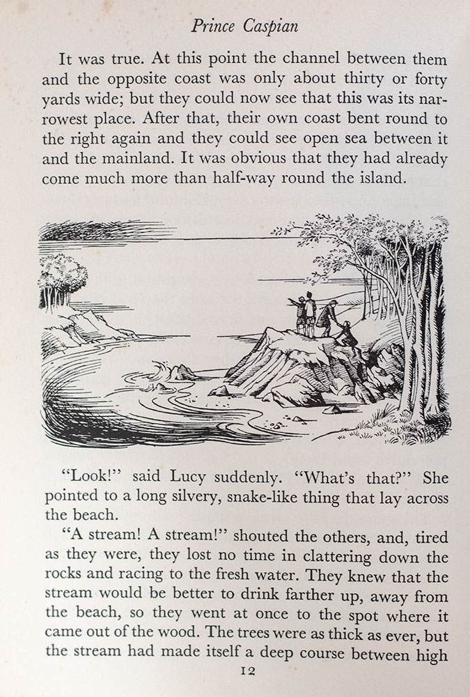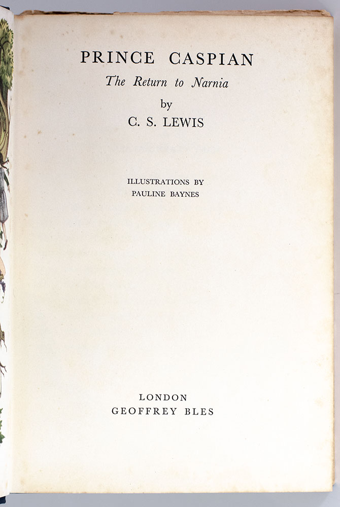 Lewis’ beloved Chronicles of Narnia “must be judged the most sustained achievement in fantasy for children by a 20th-century author” (Carpenter & Prichard, 370). The second published of seven novels in the series, Prince Caspian follows the four Pevensie children as they return to Narnia a year following their initial visit to help Narnia’s rightful ruler reclaim his throne. The Narnia tales rank “among the great classics of the [twentieth] century. Adored by children and academics alike, these books are extremely collectable, sought-after, scarce” (Connolly, 186).