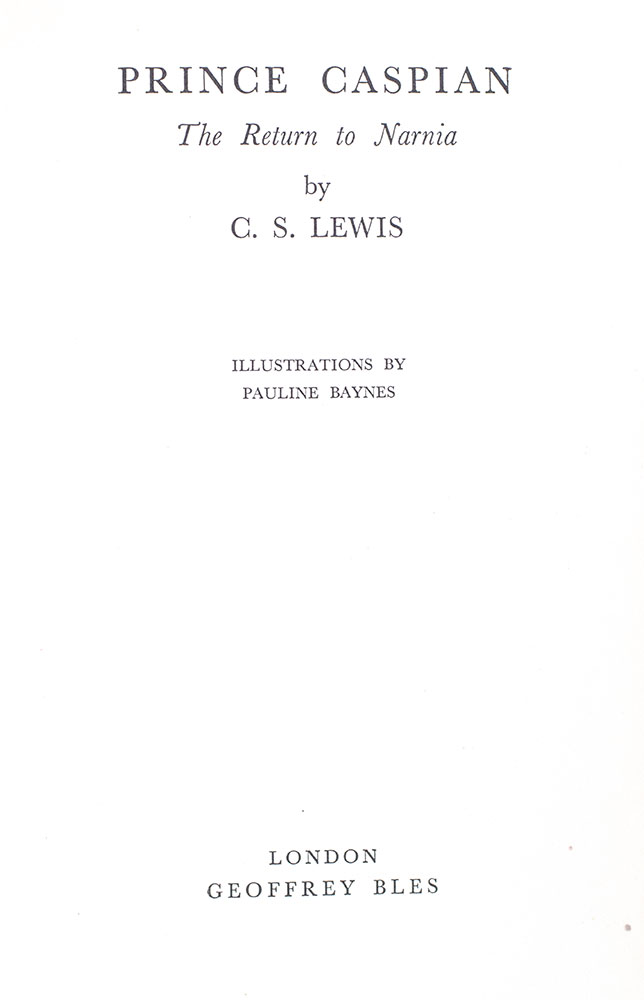 Lewis’ beloved Chronicles of Narnia “must be judged the most sustained achievement in fantasy for children by a 20th-century author” (Carpenter & Prichard, 370). The second published of seven novels in the series, Prince Caspian follows the four Pevensie children as they return to Narnia a year following their initial visit to help Narnia’s rightful ruler reclaim his throne. The Narnia tales rank “among the great classics of the [twentieth] century. Adored by children and academics alike, these books are extremely collectable, sought-after, scarce” (Connolly, 186).