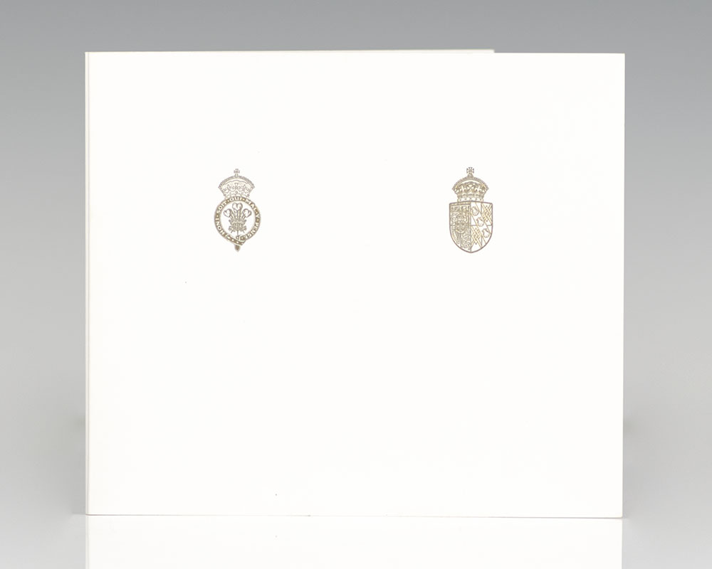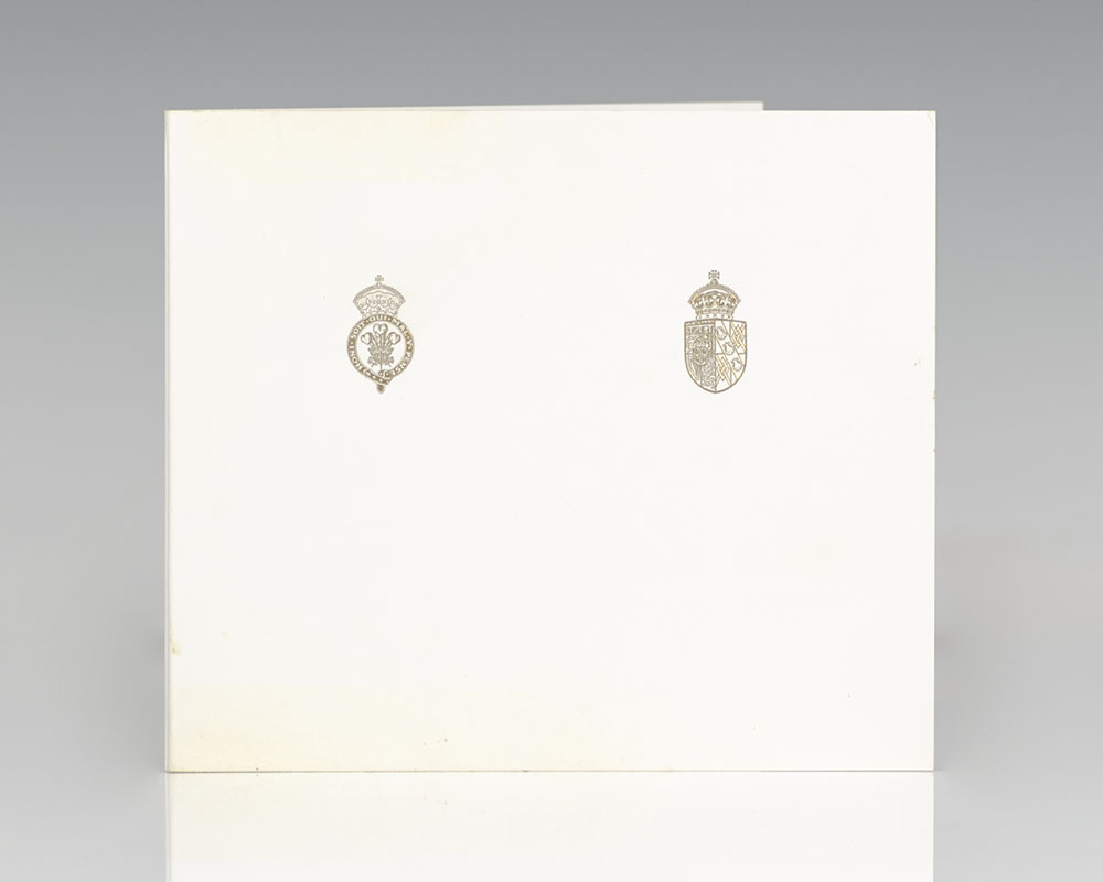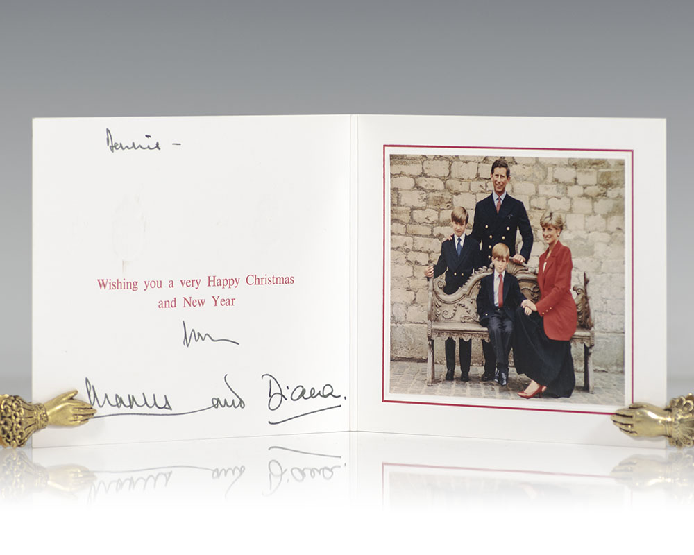 Royal Christmas card bearing two royal seals to the front panel and an original color photograph of Diana, Princess of Wales, Prince Charles and the young Princes William and Harry. Warmly inscribed by Princess Diana, "To you both, from the four of us Diana" and signed by Prince Charles "and Charles." In fine condition.