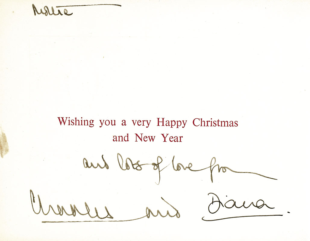 Royal Christmas and New Year card featuring an original color photograph of Diana, Princess of Wales, Prince Charles and the young Princes William and Harry. Boldly inscribed by Prince Charles, "Mollie" Wishing you and very Happy Christmas and New Year "and lots of love Charles and", and signed by Princess Diana, "Diana." In fine condition. Double matted and framed. The entire piece measures 22 inches by 13 inches.