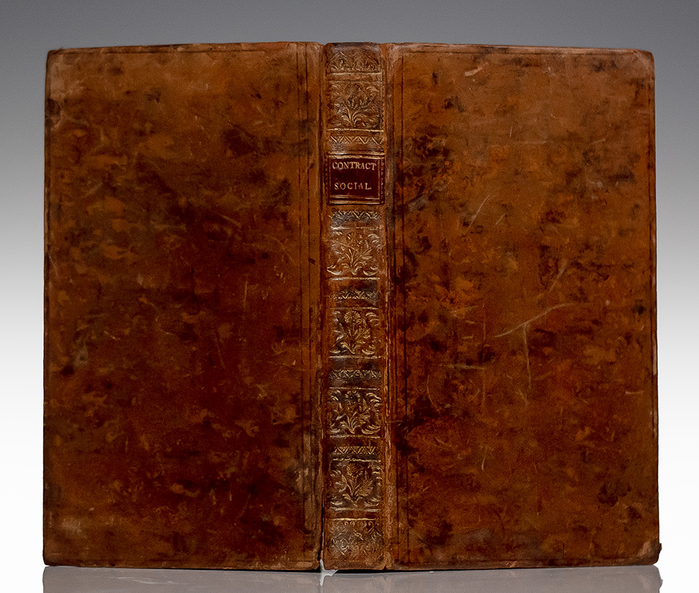 Rare first edition, type B, of Rousseau's greatest work. Octavo, bound in full contemporary sheepskin, gilt tooling to the spine in eight compartments within raised bands, burgundy morocco spine label lettered in gilt, stamped turn-ins, marbled endpapers, engraved vignette of Liberty to the title page by Boily after Bolomey, all edges red, ribbon bound in. Provenance: Perrotin-Grandville, notary in Le Mans (ownership inscription to the title page). In very good condition with scuffing to the boards, splitting to the rear lower hinge. Exceptionally rare in a contemporary binding.
