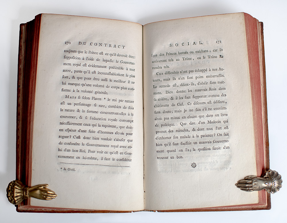 "The Contrat Social remains Rousseau's greatest work... Rousseau believed passionately in what he wrote, and when in 1789 a similar emotion was released on a national scale, the Contract Social came into its own as the bible of the revolutionaries in building their ideal state. Still in print, translated into every language in cheap editions and paperbacks, it remains a crucial document of egalitarian government" (Printing and the Mind of Man, 270, discussing the 1762 first edition). Written in 1762, Rousseau's seminal work provided a philosophical justification for revolutionary change by promoting the principles of popular sovereignty, the general will, equality, liberty, and political participation. Rousseau argued that legitimate political authority comes from the consent of the governed, rather than from divine right or hereditary monarchy. This idea inspired French revolutionaries to demand a government that represented the will of the people. Upon publication, the distribution of The Social Contract in France was prohibited, and Rousseau fled the country to avoid imprisonment. It was primarily Rousseau's chapter on civil religion, rather than his ideas on liberty and sovereignty, that caused the controversy. Immanuel Kant, one of the most influential moral philosophers in Western philosophy, acknowledged his debt to Rousseau's work in political philosophy, of which The Social Contract is perhaps the closest to a complete statement. Kant wrote, “I myself am a researcher by inclination. I feel the entire thirst for cognition and the eager restlessness to proceed further in it, as well as the satisfaction at every acquisition. There was a time when I believed this alone could constitute the honour of humankind, and I despised the rabble who knows nothing. Rousseau has set me right. This blinding prejudice vanishes, I learn to honour human beings, and I would feel by far less useful than the common labourer if I did not believe that this consideration could impart a value to all others in order to establish the rights of humanity” (Refl. 20:44).