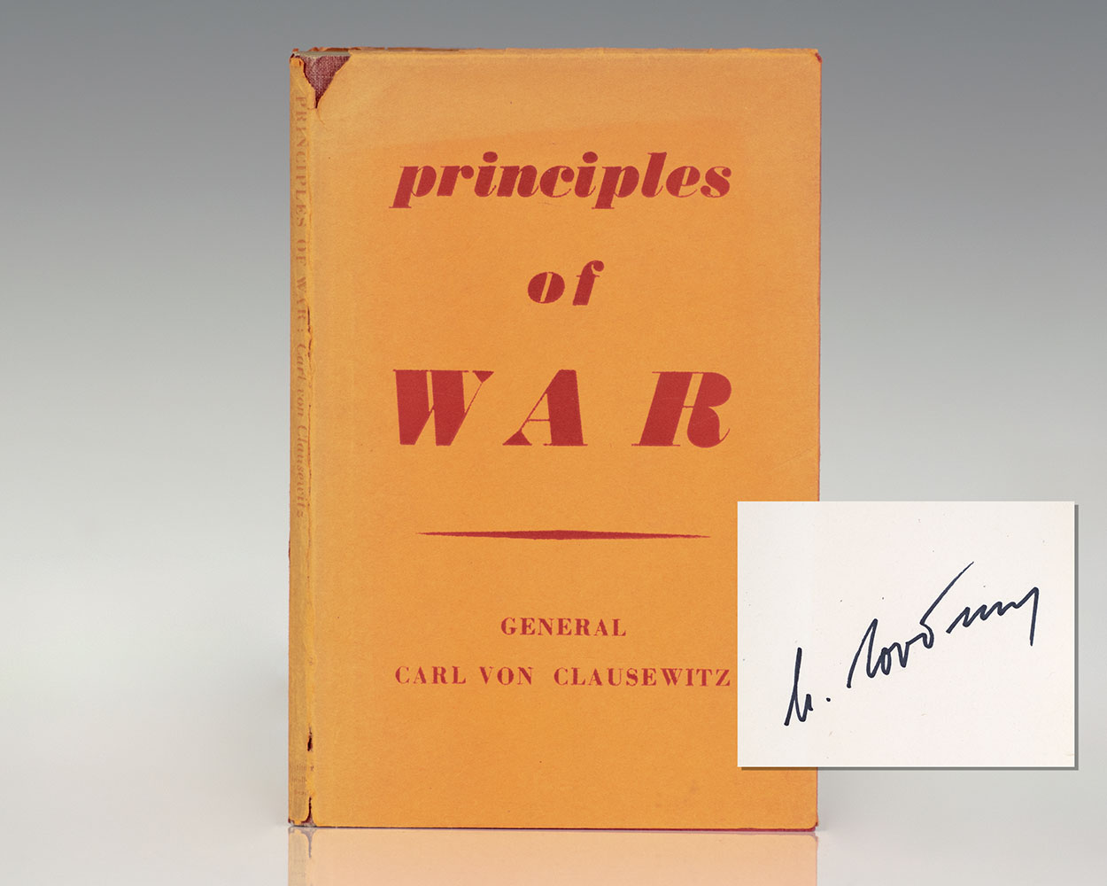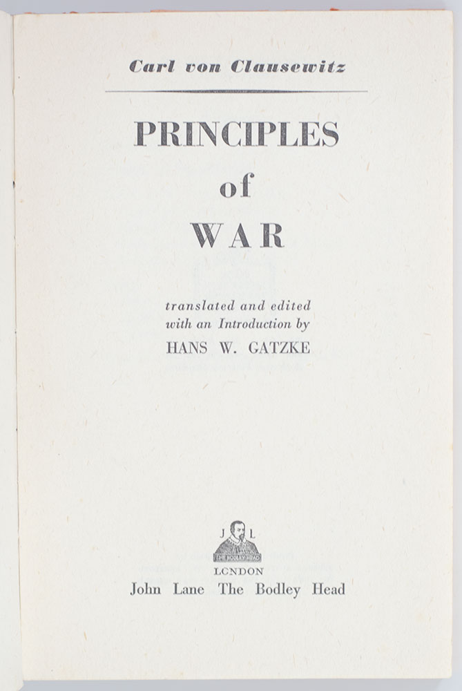 First English edition of Clausewitz's Principles, a condensed version of the theories he ultimately expanded upon in his epic military classic On War. Octavo, original half cloth over stiff paper boards. Translated and edited with an Introduction by Hans. W. Gatzke. Signed by the last leader of the Soviet Union, Mikhail Gorbachev on the front free endpaper. Mikhail Gorbachev served as the last leader of the Soviet Union from 1985 to the country's dissolution in 1991. He served as General Secretary of the Communist Party of the Soviet Union from 1985 and additionally as head of state beginning in 1988, as Chairman of the Presidium of the Supreme Soviet from 1988 to 1989, Chairman of the Supreme Soviet from 1989 to 1990 and the only President of the Soviet Union from 1990 to 1991. Although committed to preserving the Soviet state and its socialist ideals, Gorbachev believed significant reform to be necessary, particularly after the 1986 Chernobyl disaster. He withdrew troops from the Soviet–Afghan War and embarked on summits with United States president Ronald Reagan to limit nuclear weapons and end the Cold War. Near fine in a very good dust jacket. Very rare and desirable signed by one of the most significant figures of the 20th century.