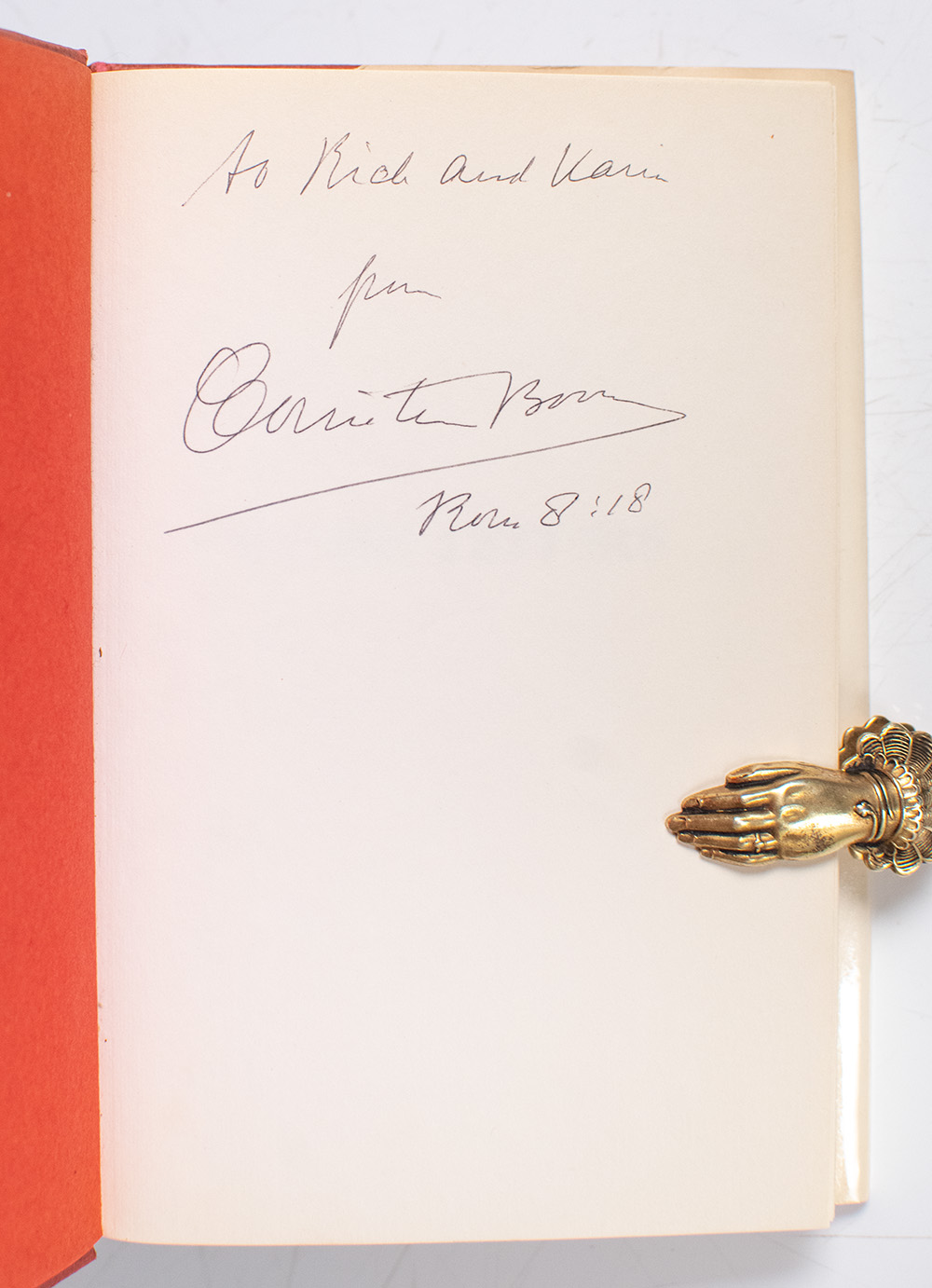 First edition of Corrie ten Boom's powerful collection of letters. Octavo, original cloth. Presentation copy, inscribed by the author, "Rick and Karin, from Corrie ten Boom Romans 8:18." Near fine a very good dust jacket. Books signed by ten Boom are rare.