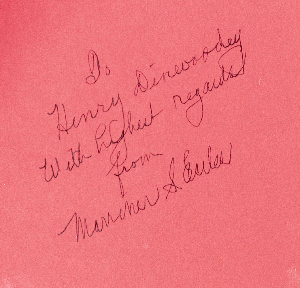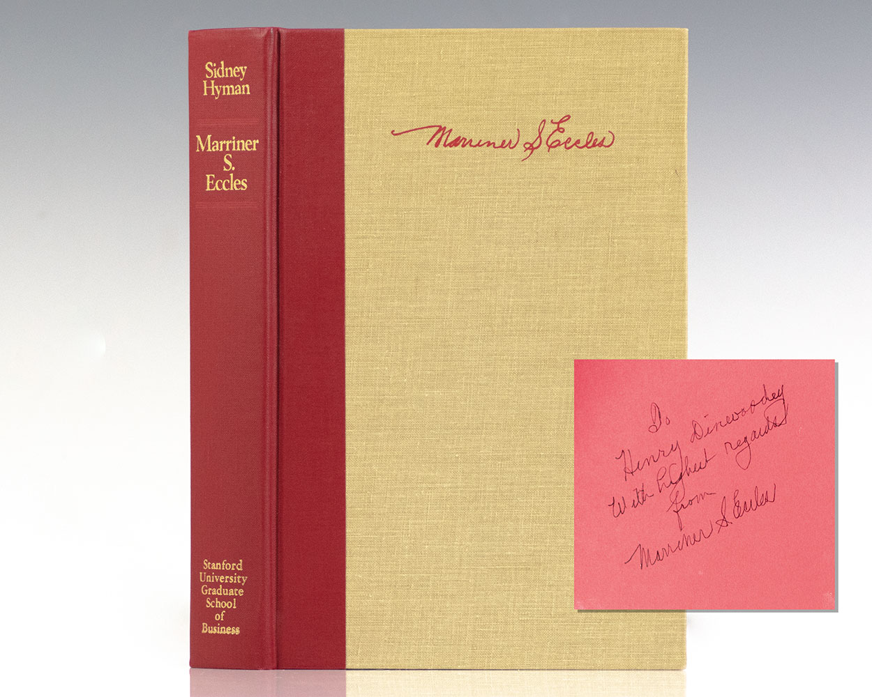 First edition of this work on the former head of the Federal Reserve. Octavo, original cloth, frontispiece. Presentation copy, inscribed by the author on the front free endpaper, "To Henry Dinevosodey with highest regards from Marriner Eccles." Foreword by G.L. Bach. In near fine condition. Uncommon signed and inscribed as Eccles passed away a year after publication.