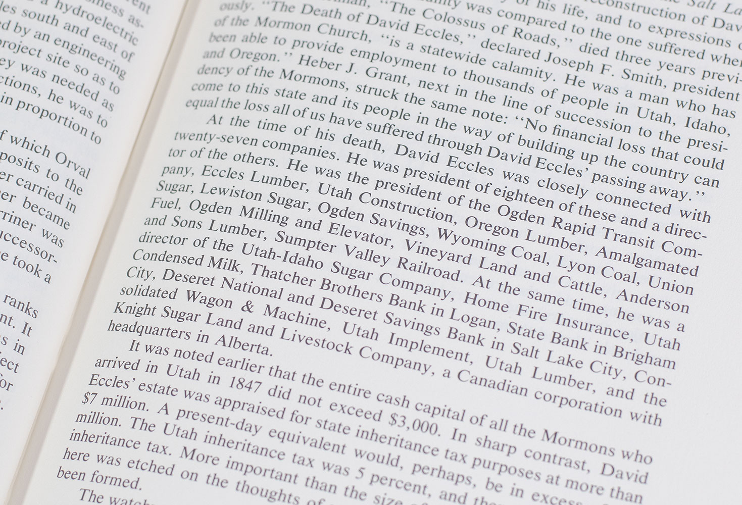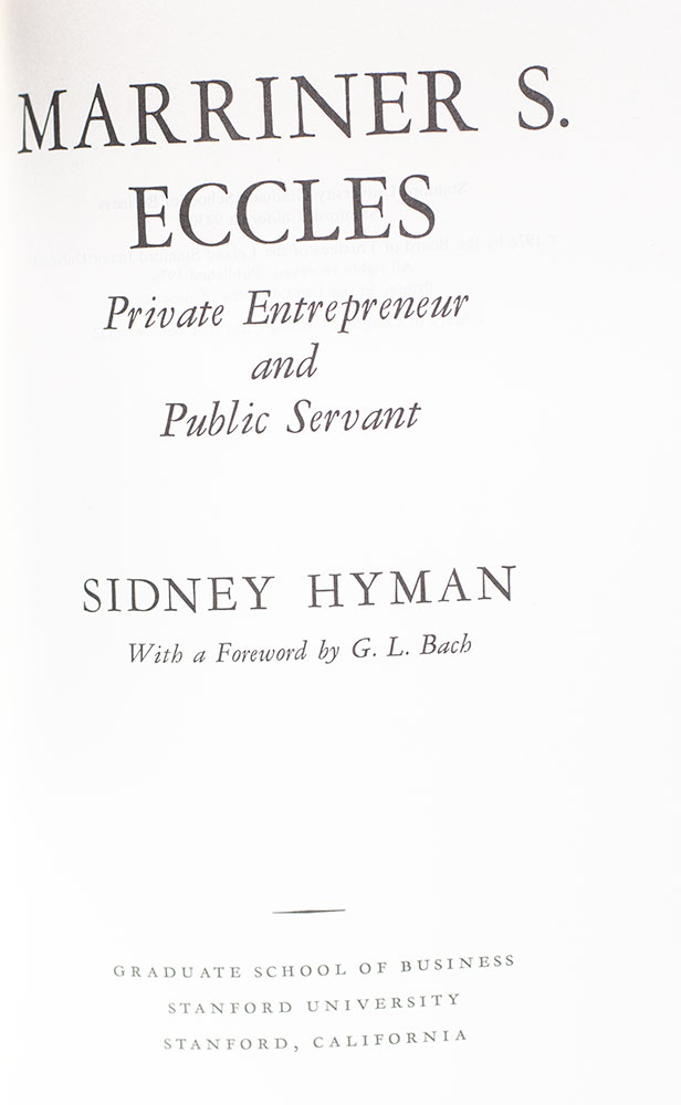 First Edition of Marriner S. Eccles: Private Entrepreneur; inscribed by Him