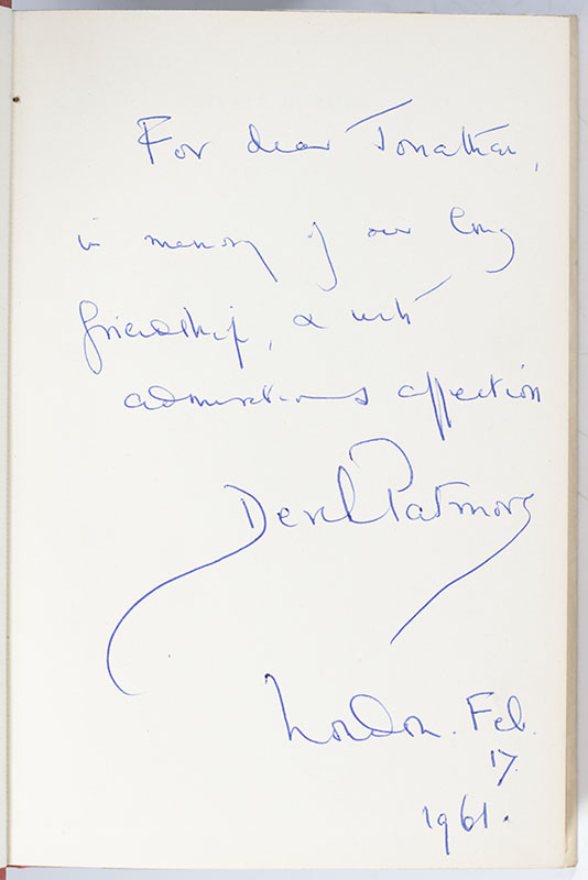 First edition of the author's autobiography. Octavo, original half cloth. Presentation copy, inscribed by the author on the front free endpaper, "For dear Jonathan, in memory of our long friendship & with admiration & affection Derek Patmore London Feb. 17 1961." Near fine in a near fine dust jacket.