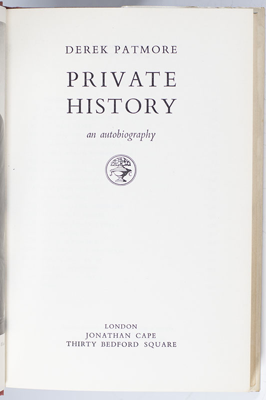 First edition of Derek Patmore's Private History: An Autobiography; lengthily inscribed by him