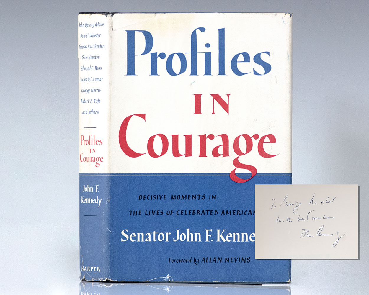 First edition, early printing of Kennedy's Pulitzer Prize-winning work. Octavo, original half cloth, with eight pages of black-and-white photogravures. Presentation copy, inscribed by the author on the front free endpaper, "To George Hickel with best wishes John Kennedy." Near fine in a very good dust jacket. Jacket design by Phil Grushkin. Foreword by Allan Nevins.
