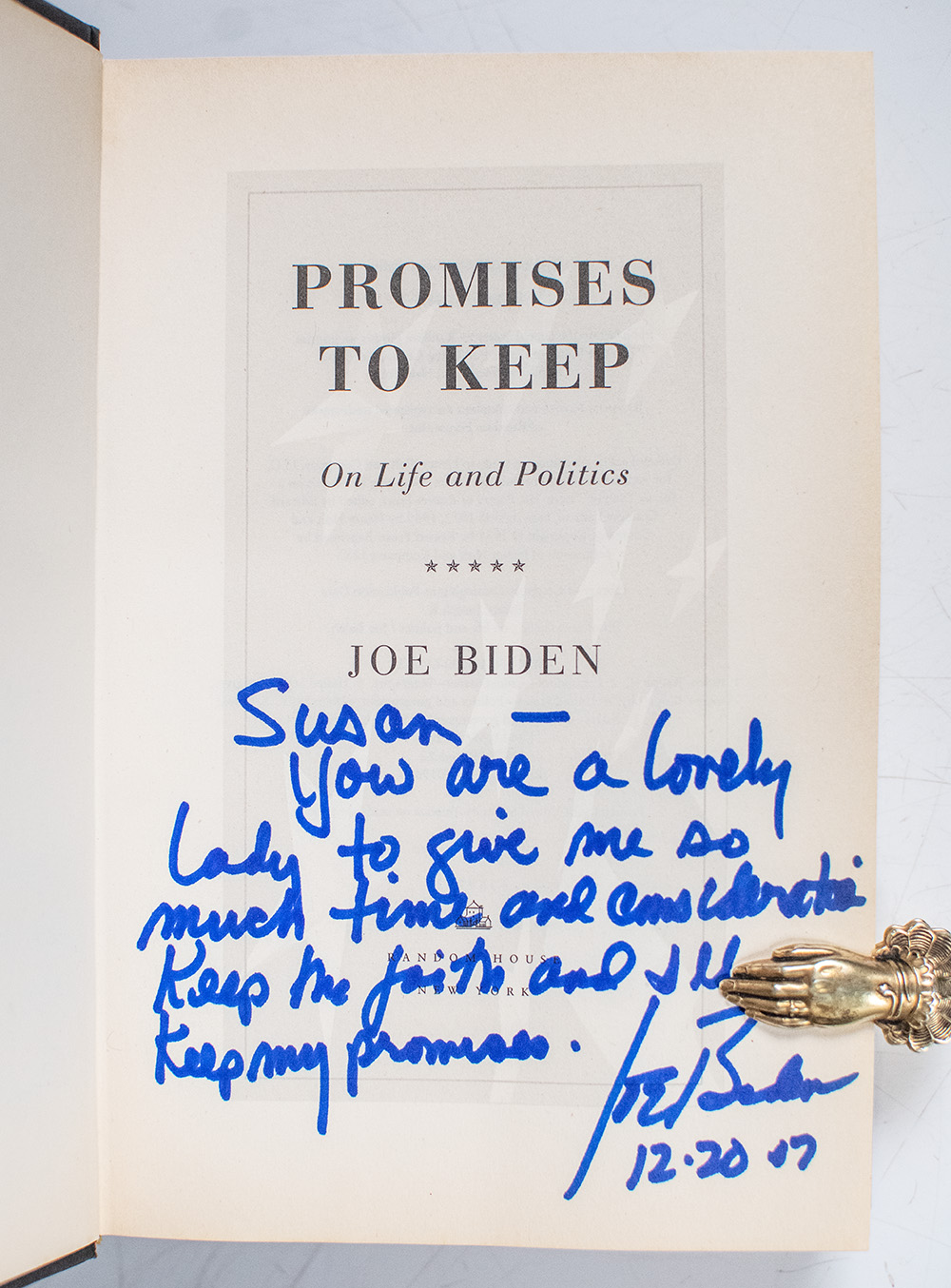 "You are a lovely lady to give me so much time and consideration. Keep the faith and I'll keep my promises": First Edition of Biden's Promises to Keep: On Life and Politics; Warmly Inscribed by Him