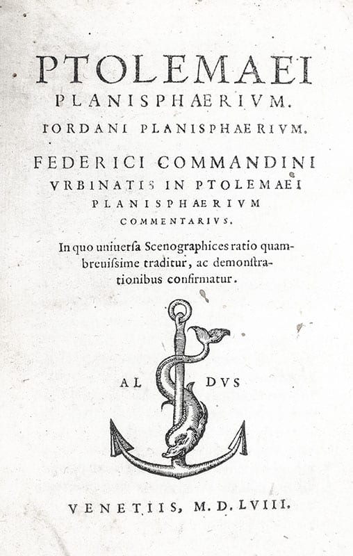 Scarce First edition of Commandino's commentary of Ptolemy's Planisphaerium; one of the few extant examples from the Aldine Press in Roman type