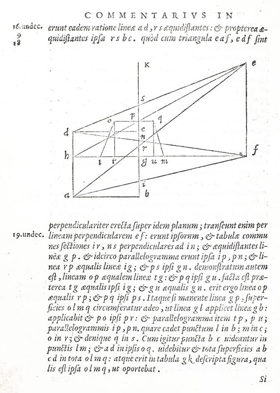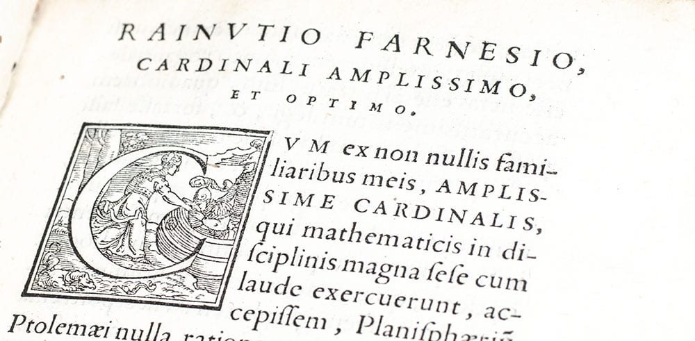 Originally written in Ancient Greek, Ptolemy's 12th century Planisphaerium was one of the major scientific works that survived from antiquity in Arabic translation. An exploration of the mathematics of mapping figures inscribed in the celestial sphere, the Planisphaerium attracted interest because stereographic projection was the mathematical basis of the plane astrolabe, an instrument which was widely used in the medieval Islamic world. This Latin version, along with Jordanus de Nemore's work on the same topic, was first printed in Basel in 1536. The editor of the present volume, Federico Commandino, was a physician to the Duke of Urbino at his household in Rome, and the author of several translations of ancient Greek mathematical treatises and commentaries published in the early 16th century. In working with Ptolemy's stereographic projection of the celestial sphere on a plane with the south celestial pole at the center, Commandino noticed that conic sections could be considered sections in visual cones or perspective images. This inspired him to include in his work a study of perspective, which occupies the majority of his commentary and represents one of the earliest mathematical formulations of a method already widely employed by artists (Adams P2242; Censimento 16; CNCE 28281; Renouard 1558/4; Ahmanson-Murphy/UCLA 449; Houzeau & Lancaster 769; Honeyman 2557; Riccardi I, 360, 1).