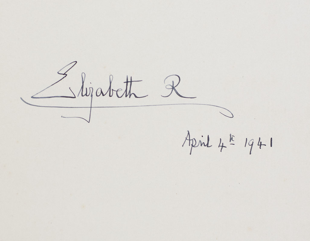 Rare American Eagle Club, London Guestbook signed by Clementine Churchill, Queen Elizabeth II, King George VI, and 14 other visitors including many dignitaries. Oblong quarto, bound in full straight grain morocco with gilt titles to the front panel, marbled endpapers, all edges gilt. Inscribed by Elizabeth II twice, on the first page of the guestbook, "Elizabeth R April 4th 1941" and the verso of the fourth page with George VI, "George R.I. February 10th 1942" and "Elizabeth R". Additionally signed by Clementine Churchill, "Clementine Churchill May the 13th 1941", influential NBC journalist and radio broadcaster Dorothy Celene Thompson, "Dorothy Thompson August 7. 1941", American peace activist and champion of the United Nations Clark Eichelberger, "Clark M. Eichelberger October 6, 1941", the "father" of the Royal Australian Air Force Richard Williams, "R Williams Air Marshall RAAF Melbourne Australia", American playwright and screenwriter Edward Knoblock, New Zealand's longest-serving high commissioner to the United Kingdom Sir William Joseph Jordan, Marchioness of Willingdon Marie Freeman-Thomas and Freeman Freeman-Thomas, 1st Marquess of Willingdon, William Sholto Douglas, 1st Baron Douglas of Kirtleside and Deputy Chief of the Air Staff. In near fine condition. A unique collection of signatures, signed at the height of the Second World War.