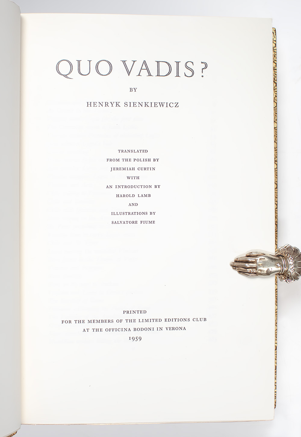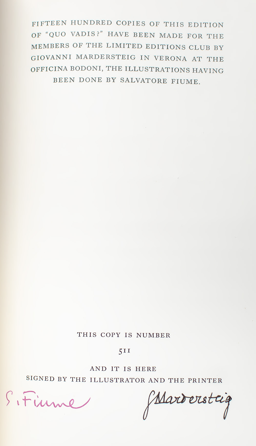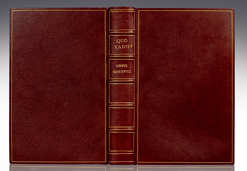 The Limited Editions Club signed limited edition of Sienkiewicz's international best-selling historical novel. Octavo, bound in full modern morocco by Sangorski & Sutcliffe/Zaehnsdorf with gilt titles and tooling to the spine in six compartments within raised gilt bands, top edge gilt, gilt turn-ins and inner dentelles, marbled endpapers, with black and white illustrations. Boldly signed by illustrator Salvatore Fiume and printer Giovanni Mardersteig of Verona at the Officina Bodoni on the colophon page at the rear. One of 1,500 numbered copies, this is number 511. In fine condition. Translated from the Polish by Jeremiah Curtin. Introduction by Harold Lamb. Illustrated by Salvatore Fiume.