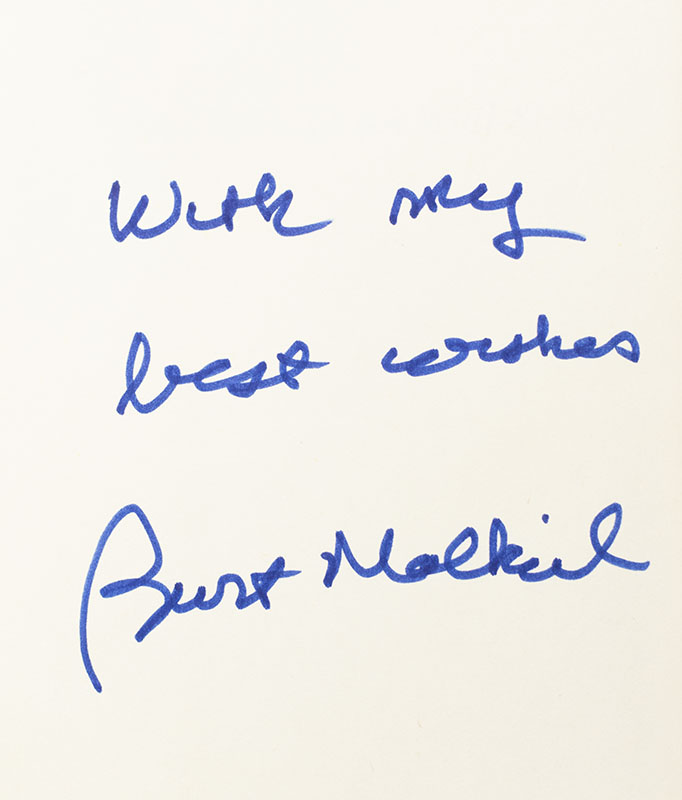 First edition of this classic work. Octavo, original cloth. Signed by the author on the front free endpaper, "With my best wishes Burt Malkiel." Near fine in a near fine price-clipped dust jacket. Jacket design by Jay J. Smith.