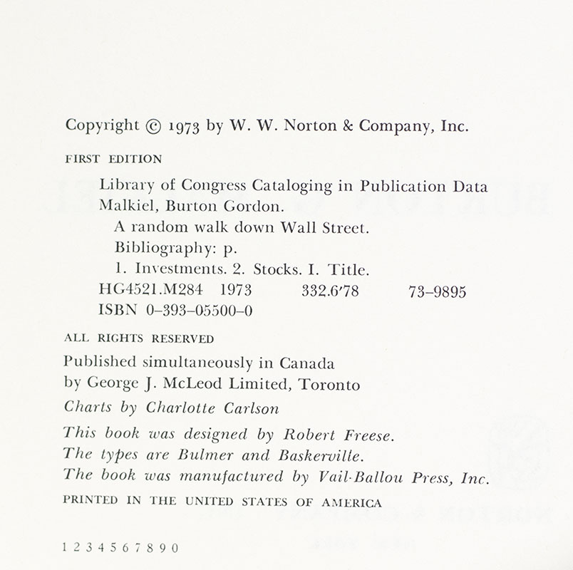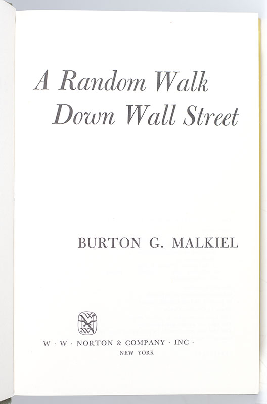 First edition of this classic work. Octavo, original cloth. Signed by the author on the front free endpaper as follows, "Portfolio betas from the past do a reasonably good job of predicting relative volatility in the future. Burt Malkiel." Fine in a near fine dust jacket. Jacket design by Jay J. Smith. Housed in a custom half morocco clamshell box.