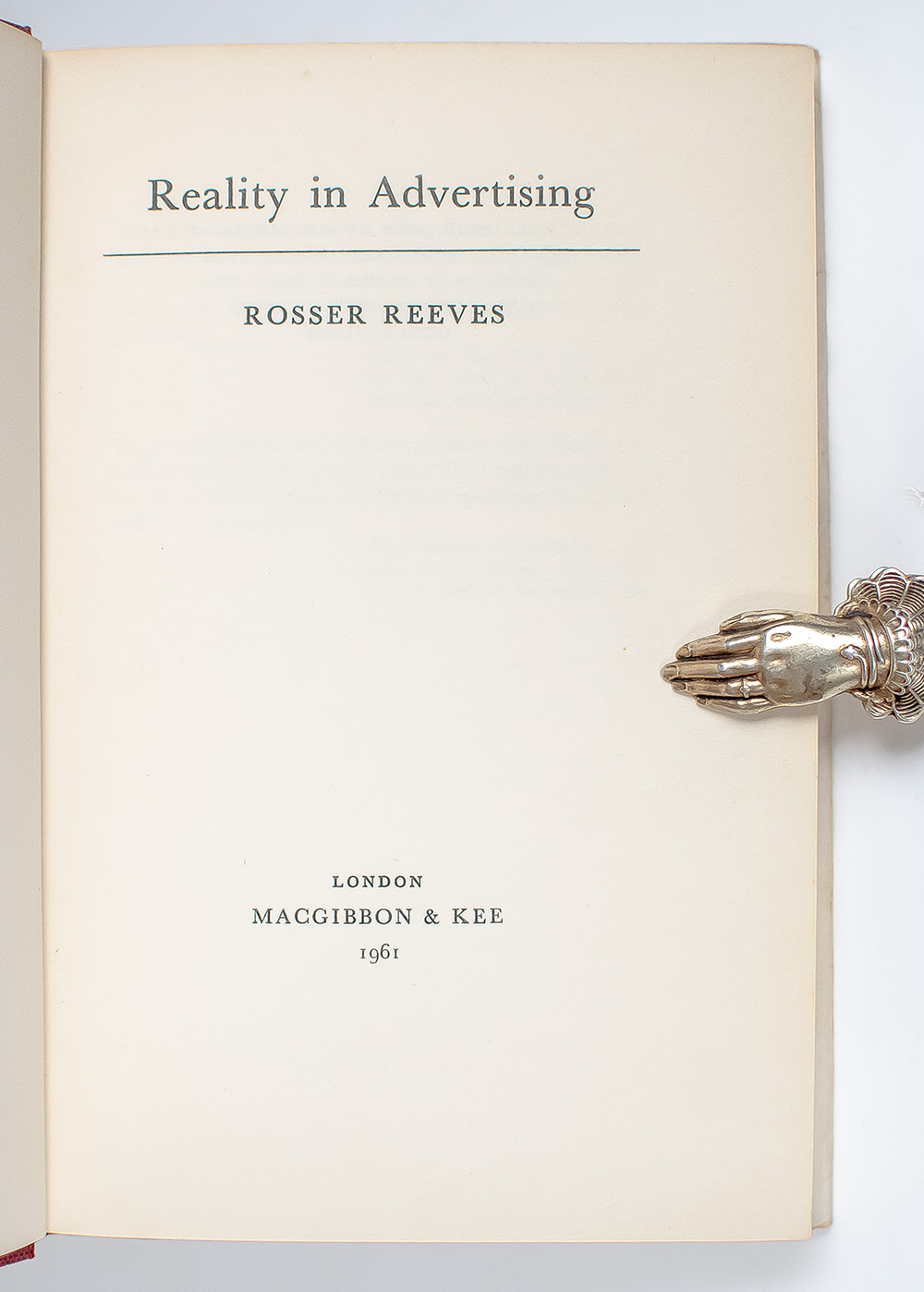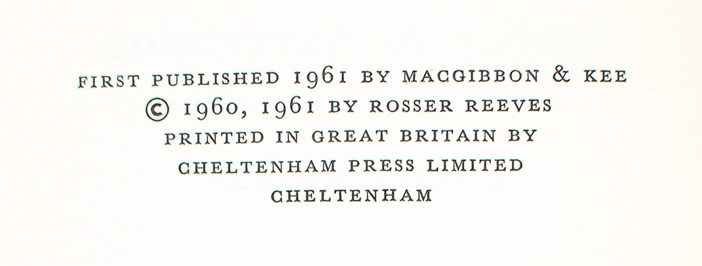 "Advertising is, actually, a simple phenomenon in terms of economics. It is merely a substitute for a personal sales force - an extension, if you will, of the merchant who cries aloud his wares": First Edition of Rosser Reeves' Reality in Advertising