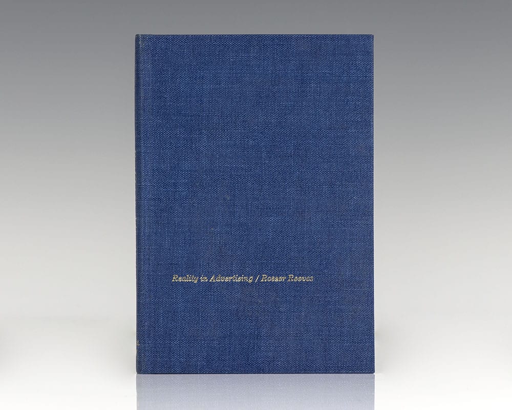 First trade edition, published after the privately printed Ted Bates edition. Octavo, original blue cloth, slipcase. Signed by the author on the front free endpaper, "With a promise that this is a very short, short book! Rosser Reeves Oct 8, 1962. Fine in the original glassine wrapper in a fine slipcase. Rare signed.