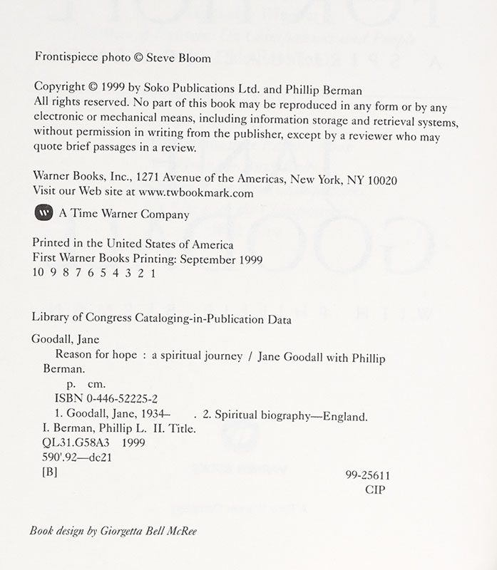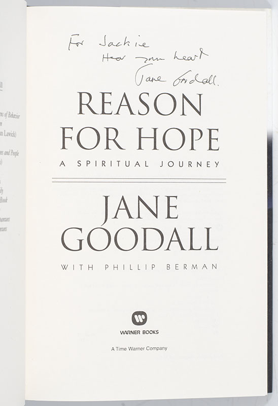 First Edition of Jane Goodall's Reason For Hope: A Spiritual Journey; Inscribed by Her