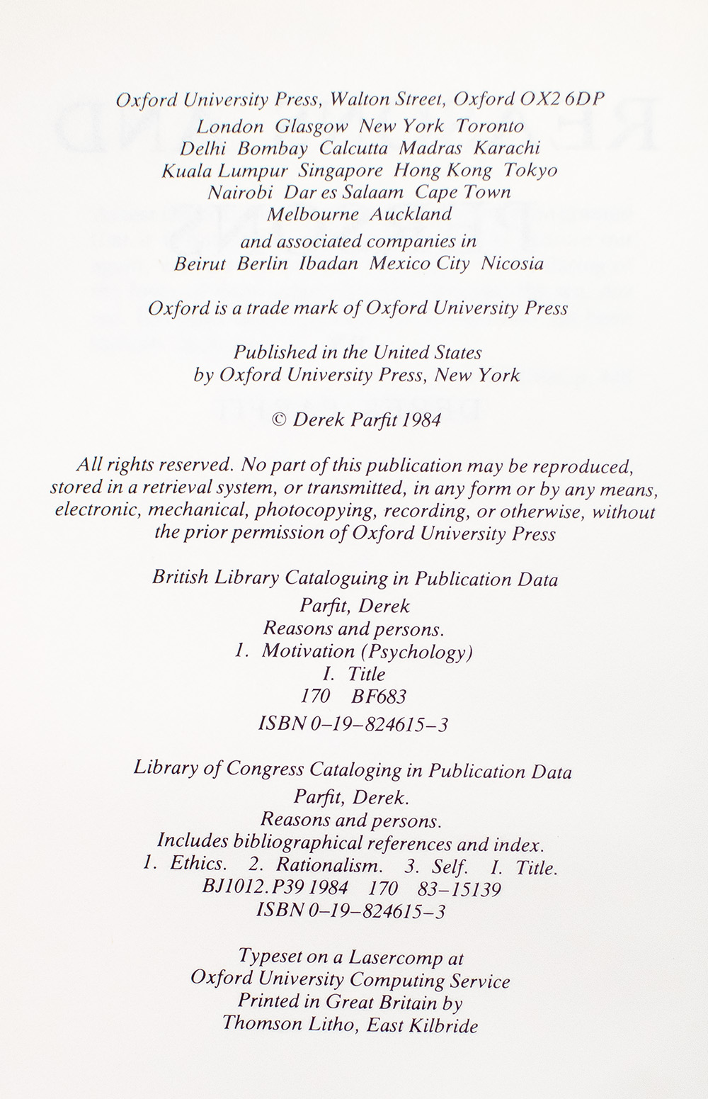 First Edition of Derek Parfit's Reasons and Persons