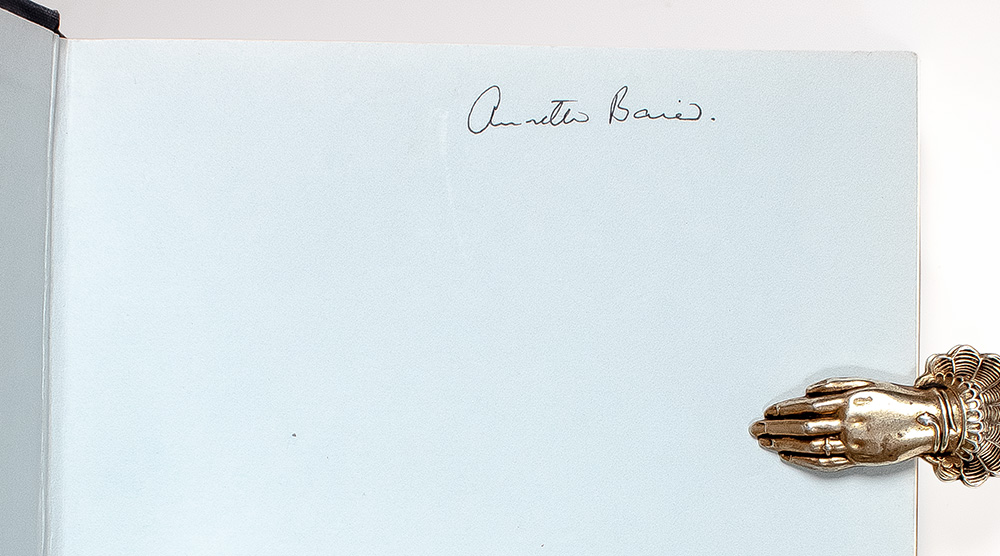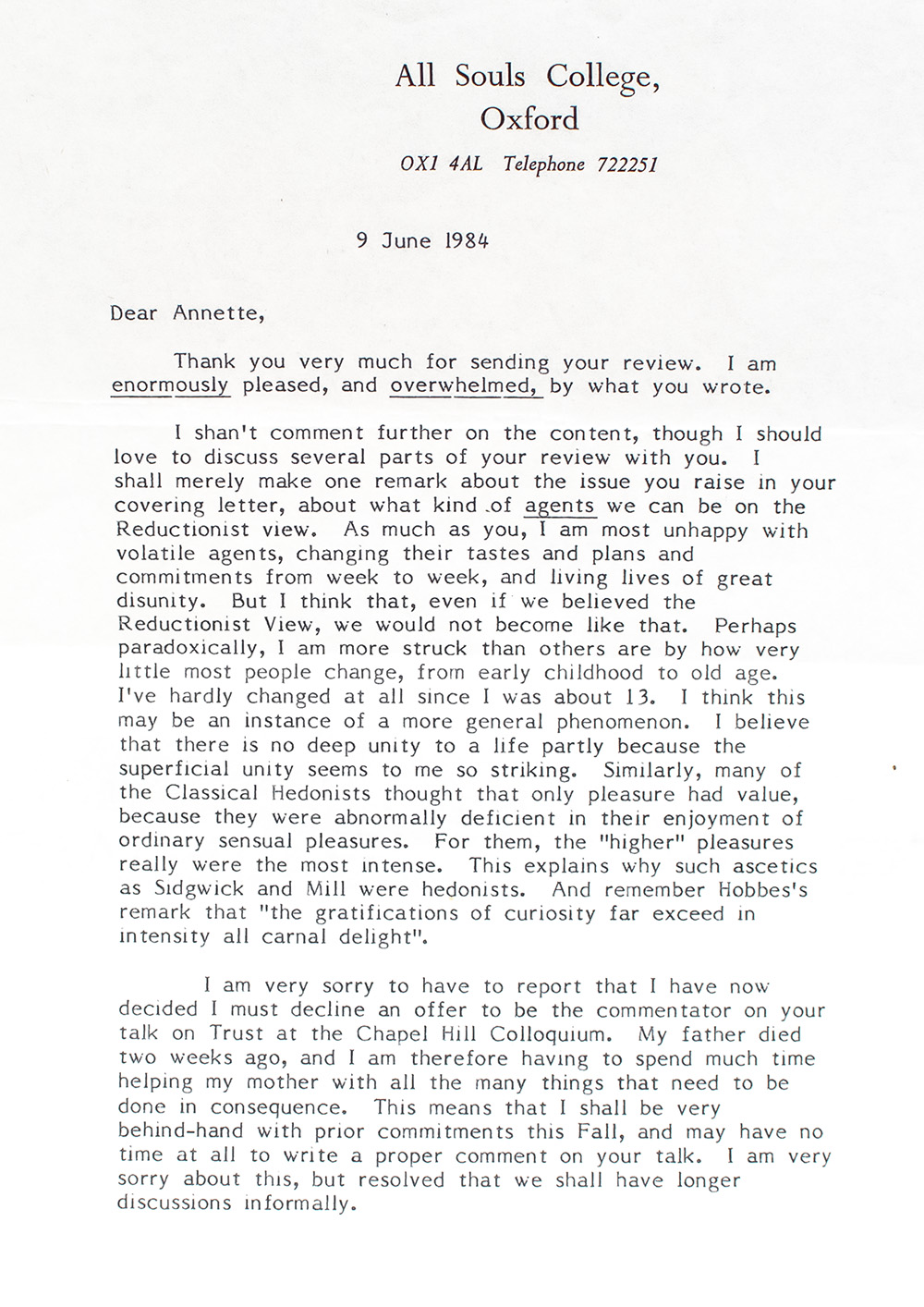 First edition of one of the most important philosophical texts of the second half the twentieth century. Octavo, original cloth. With a rare two page letter on two pages from the author Derek Parfit to fellow philosopher Annette [Baier]. The letter is on letterhead paper of All Souls College, Oxford and dated 9 June 1984 and reads, "Dear Annette, Thank you for very much for sending your review. I am enormously pleased, and overwhelmed, by what you wrote. I shan't comment further on the content, though I should love to discuss several parts of your review with you. I shall merely make one remark about the issue you raise in your Reductionist view. As much as you, I am most unhappy with volatile agents, changing their tastes and plans and commitments from week to week, and living lives of great disunity. But I think that, even if we believed the Reductionist View, we would not become like that. Perhaps paradoxically, I am more struck than others are by how very little most people change, from early childhood to old age. I've hardly changed at all since I was about 13. I think this may be an instance of a more general phenomenon. I believe that there is no deep unity to a life partly because the superficial unity seems to me so striking. Similarly, many of the Classical Hedonist thought that only pleasure had value, because they were abnormally deficient in their enjoyment of ordinary sensual pleasures. For them, the "higher" pleasures really were the most intense. This explains why such ascetics as Sidgwick and Mill were hedonists. And remember Hobbes's remark that "the gratification of curiosity far exceed in intensity all carnal delight". I am very sorry to have to report that I have now decided I must decline an offer to be the commentator on your talk on Trust at the Chapel Hill Colloquium. My father died two weeks ago, and I am therefore having to spend much time helping my mother with all the many things that need to done in consequence. This means that I shall be very behind-hand with prior commitments this Fall, and may have to time at all to write a proper comment on your talk. I am very sorry about this, but resolved that we shall have longer discussions informally. I must end by saying again how thrilled I was by your review. I have been feeling drained lately, but reading your review aroused in me a sudden strong desire to write another book. I had no such desire before I read what your wrote. [Handwritten] "Yours, with great affection, Derek." The recipient, Annette Baier was a New Zealand philosopher and Hume scholar, who focused in particular on Hume's moral psychology. Baier's approach to ethics is that women and men make their decisions about right and wrong based on different value systems: men take their moral decisions according to an idea of justice, while women are motivated by a sense of trust or caring. The history of philosophy having been overwhelmingly compiled by men, she suggests, leads to a body of thought which apparently ignores the role of nurture and trust in human philosophy. Fine in a very good dust jacket. Annette Baier ownership signature to the front free endpaper. An exceptional association linking these two great philosophers.