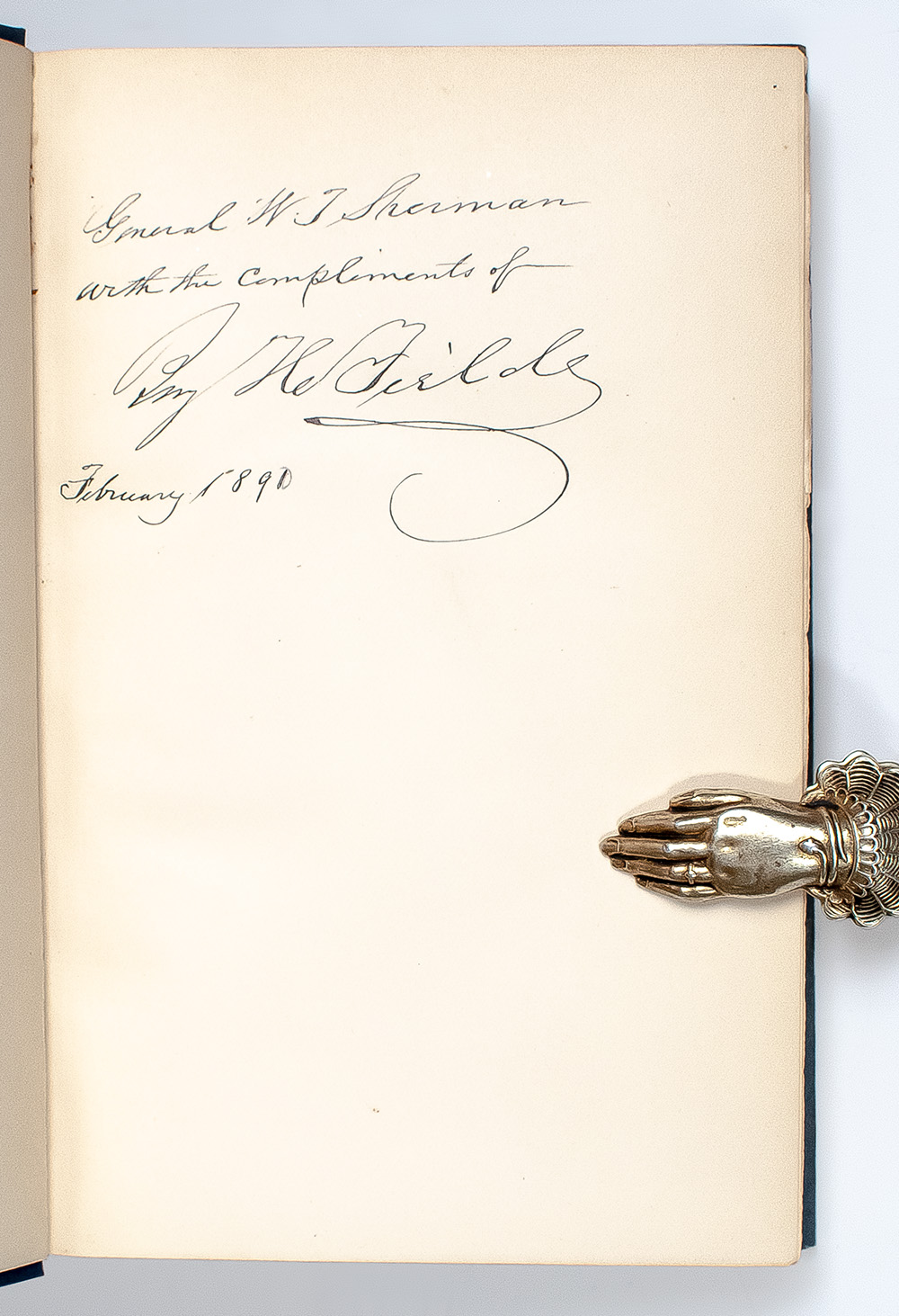 First edition of the autobiography of the famous publisher and co-owner of Philedelphia's Public Ledger; from the library of General William Tecumseh Sherman. Duodecimo, bound in contemporary blue half calf with gilt titles, tissue-guarded frontispiece portrait of George W. Childs. General William Tecumseh Sherman and his son P. T. Sherman’s booklates to the front pastedown. Association copy, inscribed by the author on the front flyleaf, "General W.T. Sherman with the compliments of George W. Fields February 1890." In very good condition with light rubbing, inscription in pencil to the front panel listing the pages with General Sherman's mentions in the book. General Sherman's library was inherited by P. T. Sherman, who transferred the library to his niece, Eleanor Sherman Fitch, the granddaughter of General Sherman through his eldest daughter, Maria “Minnie” Ewing Sherman Fitch, before he died. Until now, the book was held at the family estate in Washington County, Pennsylvania. An exceptional association.