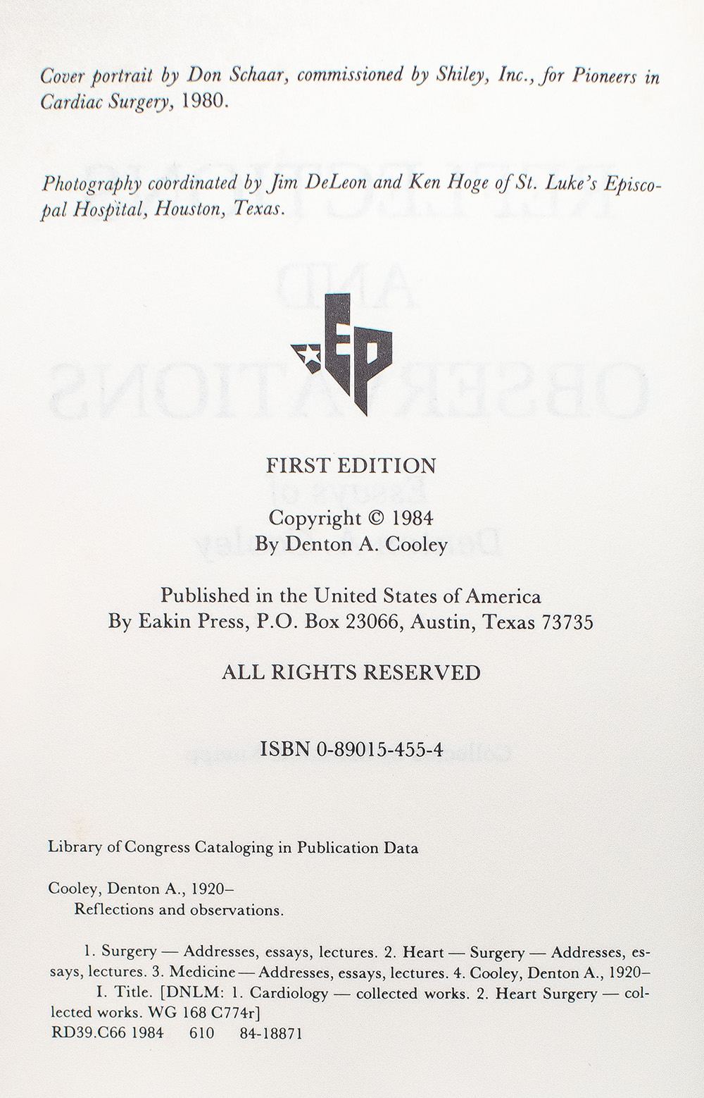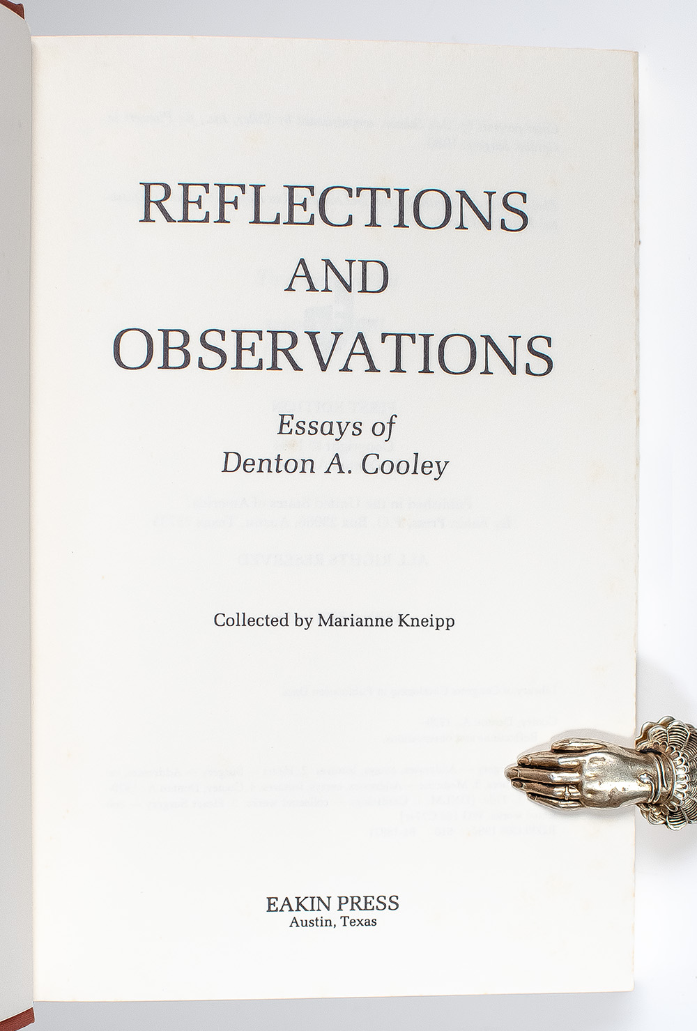 First Edition of Reflections and Observations: Essays of Denton A. Cooley; signed by Denton A. Cooley