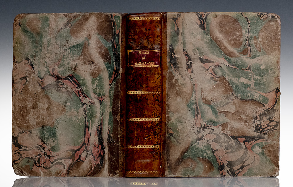 First edition of this important work on the Strait of Magellan. Quarto, two volumes bound into one in contemporary calf-backed marbled boards with gilt tooling to the spine, morocco spine label lettered in git, engraved frontispiece portrait of Magellan, 5 large folding maps on heavy paper and 5 folding tables. An important work on the Strait of Magellan, the voyages described in this volume, under the command of Antonio de Cordoba, were made to assess the advisability of Spanish voyagers to use the Strait in voyages to the Pacific. So negative were his conclusions about navigation around Cape Horn and through the Straits, that Spanish trade was routed overland from the eastern to Pacific ports. The maps illustrate the various ports and trade routes. Hill 305. Palau 352514. Sabin 16765. In very good condition. A fine production of Ibarra's presses. Spanish printer Joaquín Ibarra made several important technical developments in press printing, book-making, typography and paper-making. In his printed work, Ibarra sought to achieve a perfect flow of harmonious type, inks, illustration, margins, and textures. He worked with the best painters and engravers of his time and, based on a secret formula he developed, the Ibarra ink gained a reputation for its exceptional quality and brilliance.