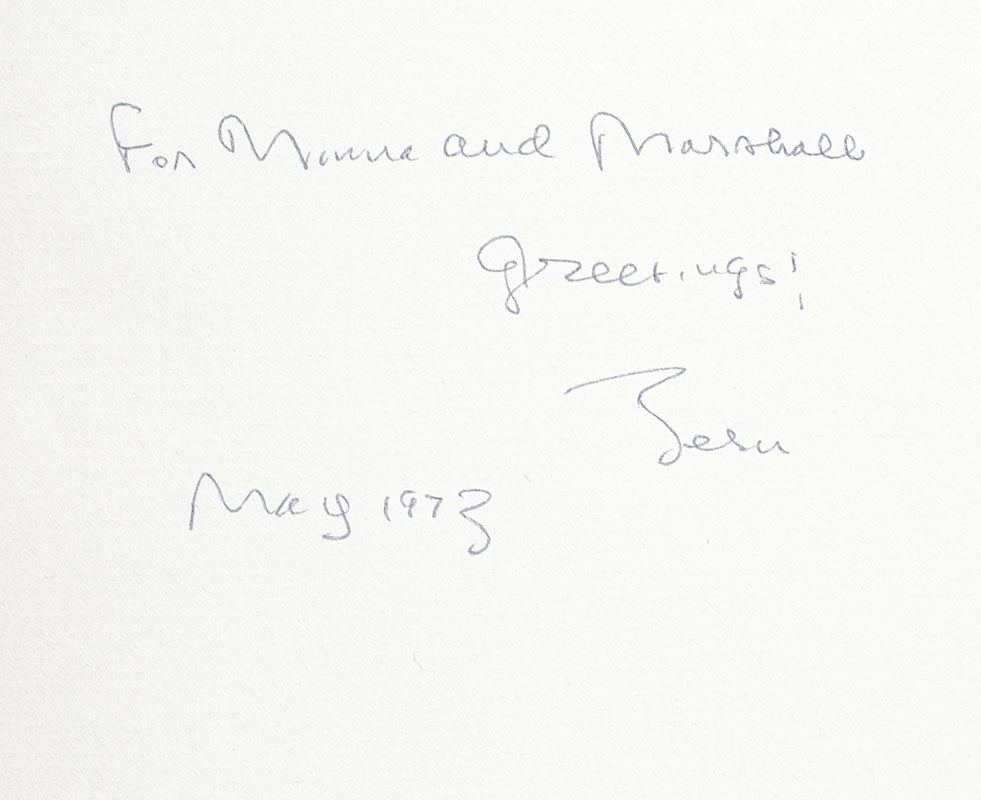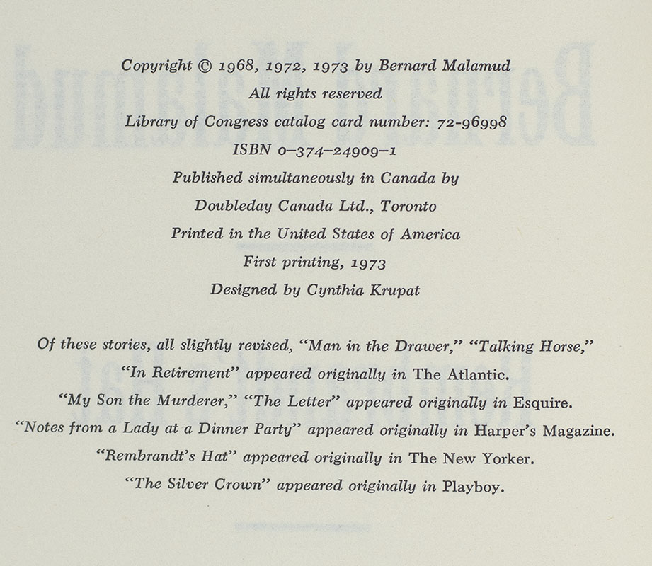 First edition of this collection of short stories by the author of The Natural. Octavo, original half cloth. Association copy, inscribed by the author on the front free endpaper in the year of publication to his cousins, "For Minnie and Marshall Greetings! Bern May 1973." Near fine in a very good dust jacket. Jacket design by Muriel Nasser. Jacket photograph by Janna Malamud.