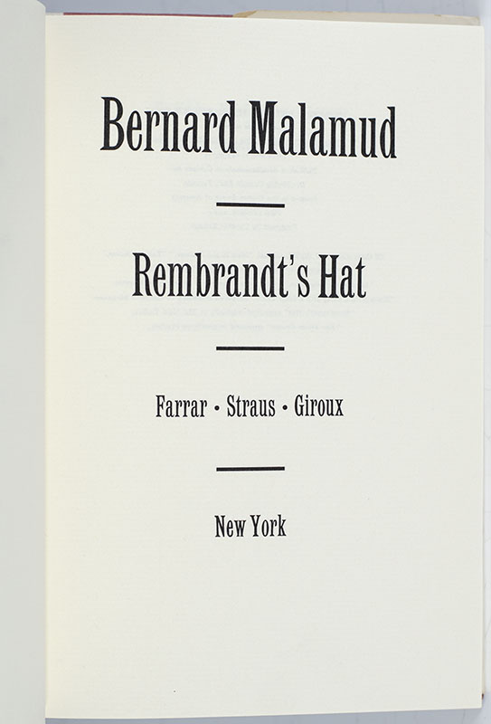 First Edition of Bernard Malamud's Rembrandt's Hat: Inscribed by Him to his cousins