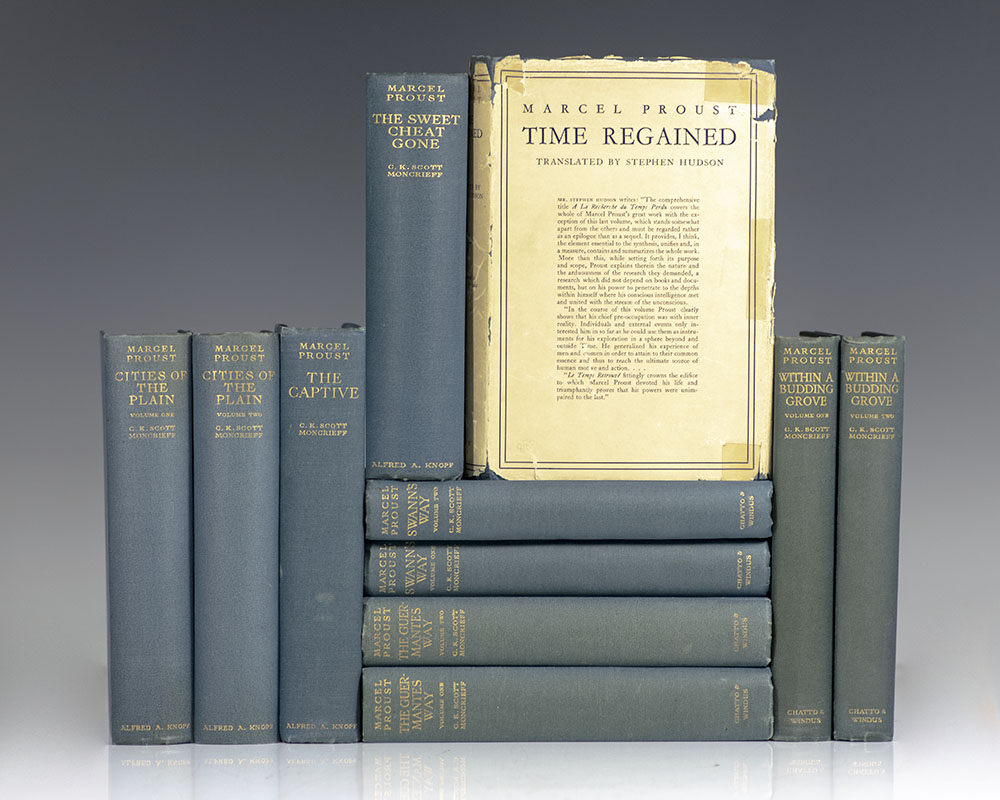 Complete first edition set of Proust's most well-known work. Octavo, 11 volumes, original blue cloth with titles to the spine in in gilt. In near fine condition, with Time Regained in the rare dust jacket. Translated by C.K. Scott Moncrieff. An excellent set, rare in this condition.