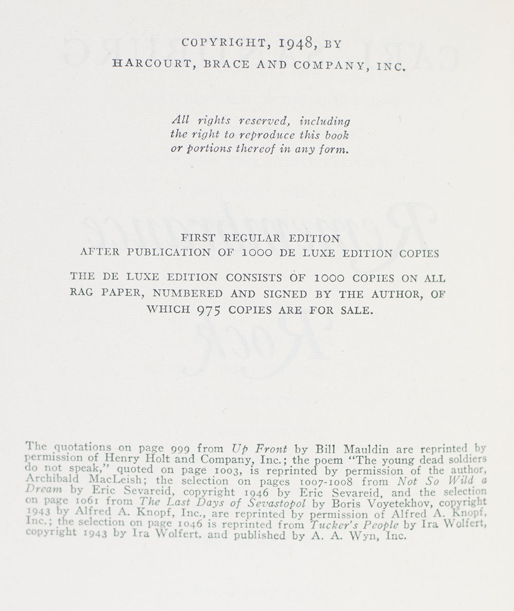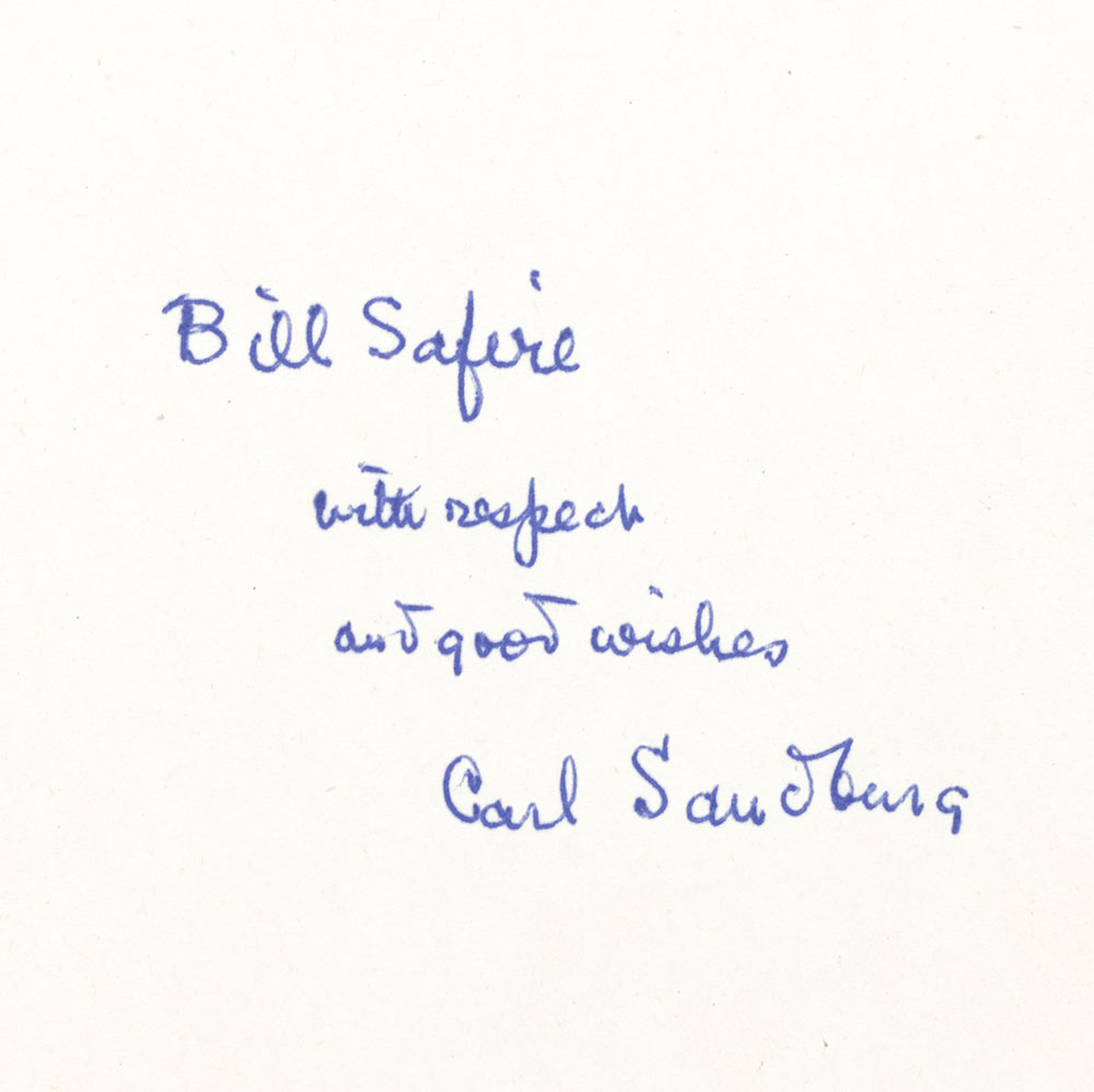 First trade edition of Sandburg's self-described "epic, weaving the mystery of the American Dream with the costly toil and bloody struggles that have gone to keep alive and carry further that Dream." Octavo, bound in three quarter morocco with gilt titles and tooling to the spine in six compartments within raised gilt bands, marbled endpapers, top edge gilt. Association copy, inscribed by the author on the third free endpaper, "Bill Safire with respect and good wishes Carl Sandburg." The recipient, William Safire, was an important American author, Pulitzer Prize-winning columnist, journalist, and presidential speechwriter. He joined Nixon’s campaign in the 1960 Presidential race, and again in 1968. Following Nixon’s 1968 victory, Safire served as a presidential speechwriter for both Nixon and Vice President Spiro Agnew. He was a frequent guest on Meet The Press, describing himself as the voice of “libertarian conservatives” and authored several political columns, most notably his weekly column “On Language” which appeared in The New York Times Magazine from 1979 until the month of his death in 2009. He authored two books on grammar and linguistics: The New Language of Politics (1968) and what Zimmer called Safire’s “magnum opus,” Safire’s Political Dictionary. Safire later served as a member of the Pulitzer Prize Board from 1995 to 2004 and in 2006 was awarded the Presidential Medal of Freedom by President George W. Bush. In very good condition. With Safire's bookplate to the pastedown.