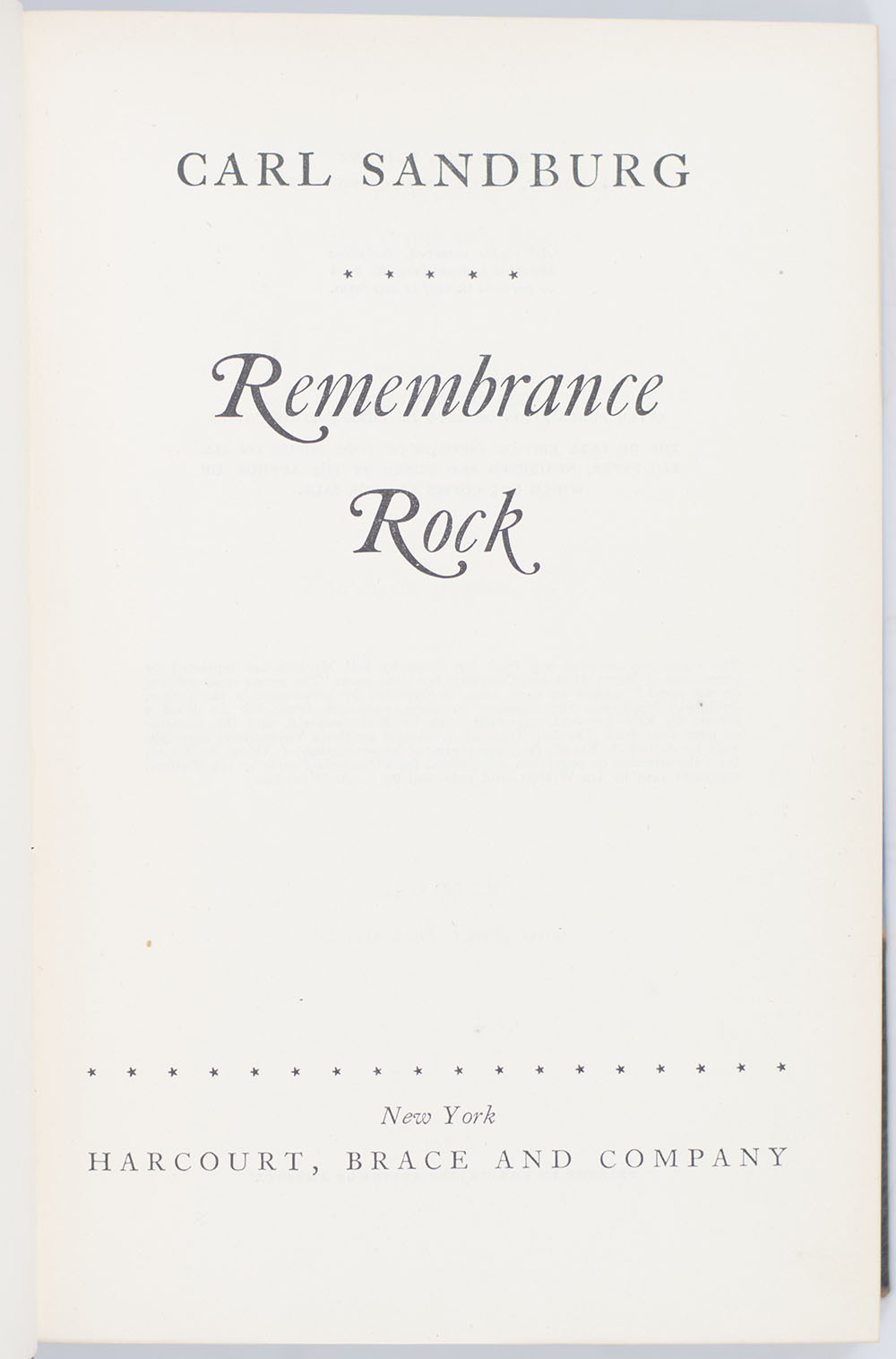 First edition of Carl Sandburg's Remembrance Rock; inscribed by him to American Journalist Bill Safire