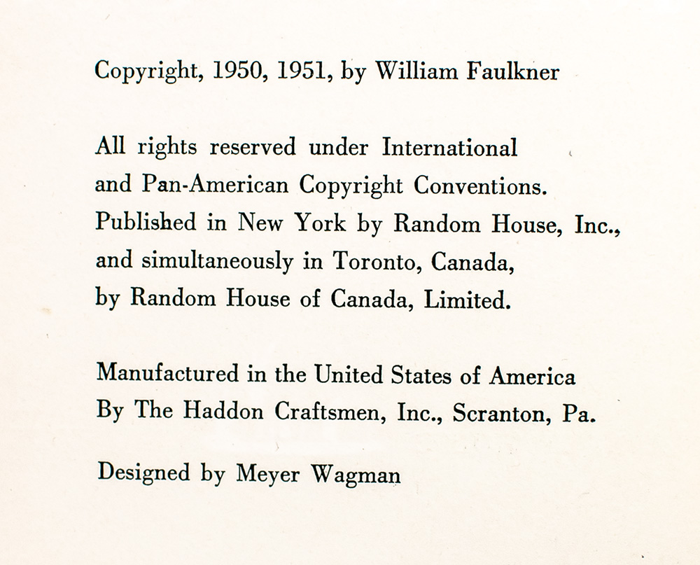 First trade edition of the sequel to Faulkner's early novel 'Sanctuary.' Octavo, original half cloth. First state with all issue points: first edition not stated, dark gray top stain, 'Chocktaw' rather than 'Choctaw' on page 21, dust jacket designer E. McKnight Kauffer's name misspelled as 'M. McKnight Kauffer' on the front flap of the dust jacket. Near fine in a near fine dust jacket. A very sharp example.